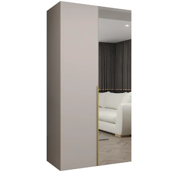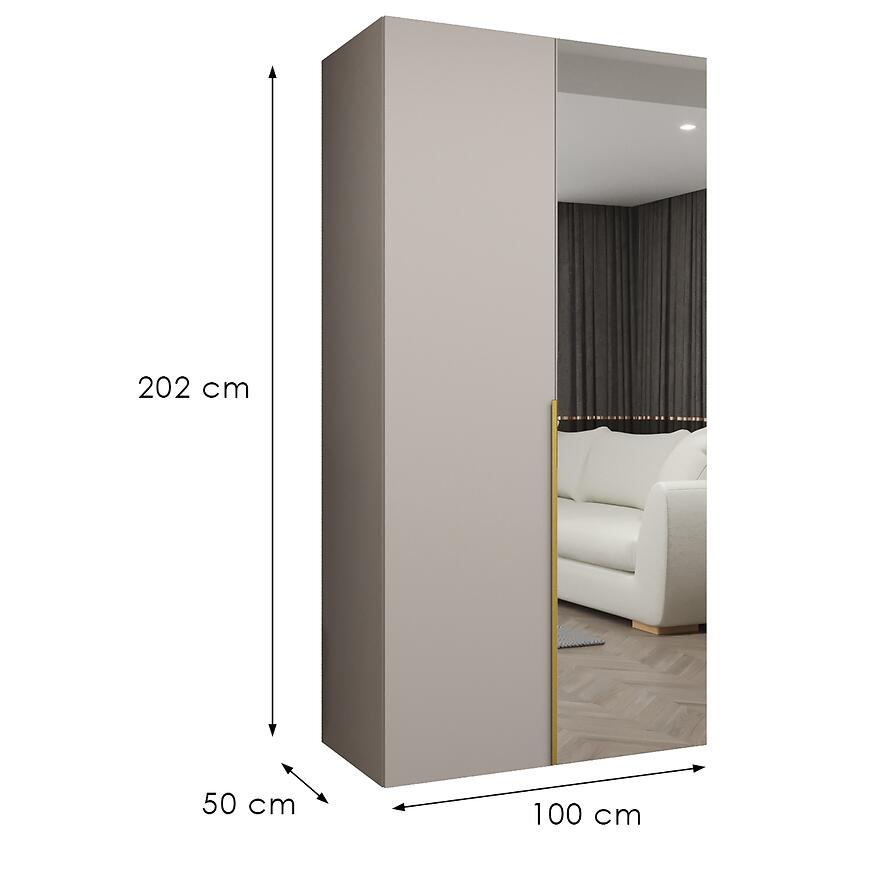 Szafa Alicante II 100 kaszmir/złoty to propozycja dla osób, które poszukują estetycznego i praktycznego mebla do przechowywania ubrań oraz dodatków. Dzięki szerokości 100 cm, wysokości 202 cm i głębokości 50 cm szafa doskonale sprawdzi się zarówno w sypialni, jak i w przedpokoju czy garderobie. Prosta bryła, klasyczne drzwi oraz nowoczesny styl sprawiają, że model z kolekcji ALICANTE łatwo dopasować do wielu aranżacji wnętrz. Zastosowanie lustra na froncie nie tylko podnosi walory wizualne mebla, ale również optycznie powiększa przestrzeń, co jest szczególnie istotne w mniejszych pomieszczeniach.