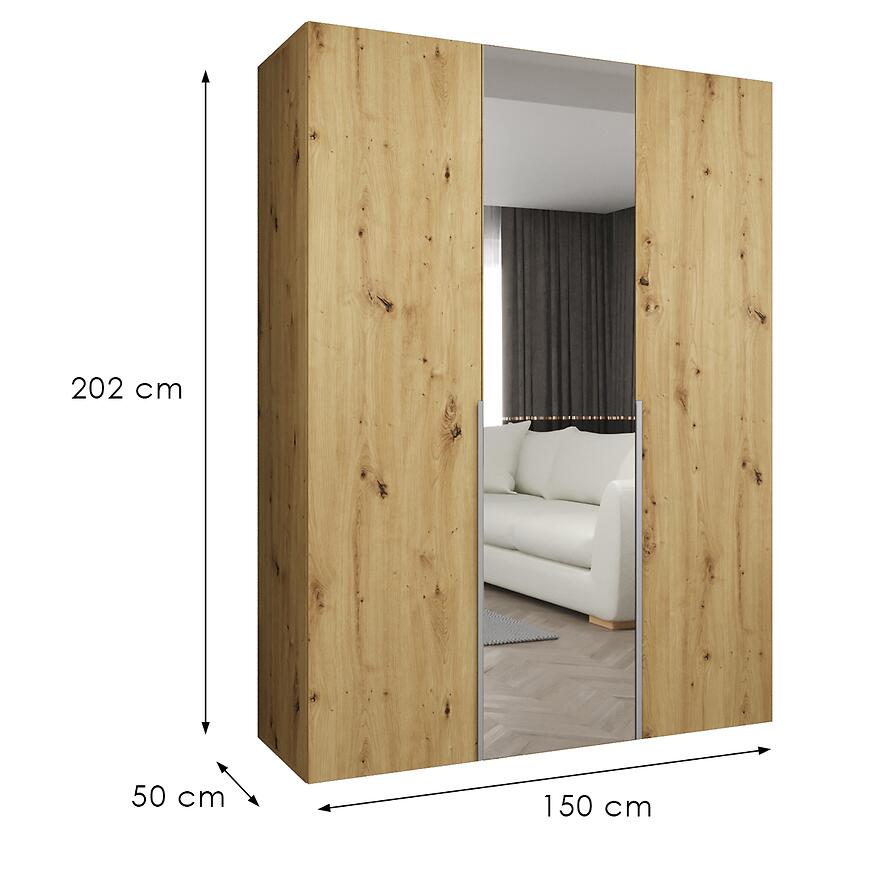 Szafa Alicante II 150 jako szafa trzydrzwiowa oferuje wygodny podział przestrzeni wewnętrznej, umożliwiając przechowywanie odzieży wiszącej, złożonych ubrań oraz domowych tekstyliów. Jej wymiary sprawiają, że jest to dobry wybór do mieszkań, w których potrzebna jest pojemna szafa o umiarkowanej głębokości. Głębokość 50 cm pozwala na komfortowe przechowywanie ubrań bez zajmowania nadmiernej ilości miejsca w pomieszczeniu. Klasyczne drzwi otwierane to rozwiązanie cenione za łatwy dostęp i prostą obsługę, szczególnie w pomieszczeniach o standardowym układzie.