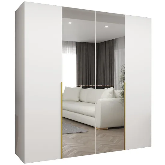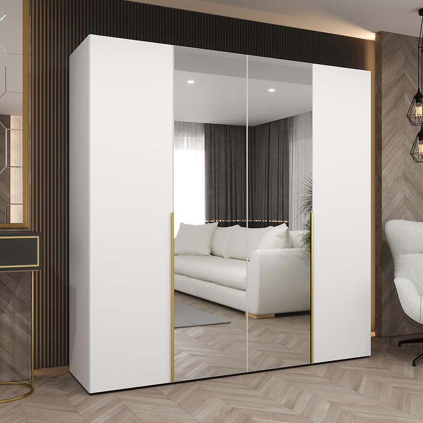 Szafa Alicante II 200 biały/złoty z kolekcji ALICANTE to propozycja dla osób poszukujących pojemnej, estetycznej i dobrze zaprojektowanej szafy do sypialni, przedpokoju lub garderoby. Szerokość 200 cm, wysokość 202 cm oraz głębokość 50 cm sprawiają, że mebel oferuje dużą przestrzeń do przechowywania ubrań, a jednocześnie nie dominuje wizualnie wnętrza. Prosty kształt i nowoczesny styl czynią tę szafę uniwersalnym elementem aranżacji, który łatwo dopasować do różnych koncepcji wystroju. Obecność lustra na frontach optycznie powiększa pomieszczenie i zwiększa komfort codziennego użytkowania, szczególnie w mniejszych wnętrzach.