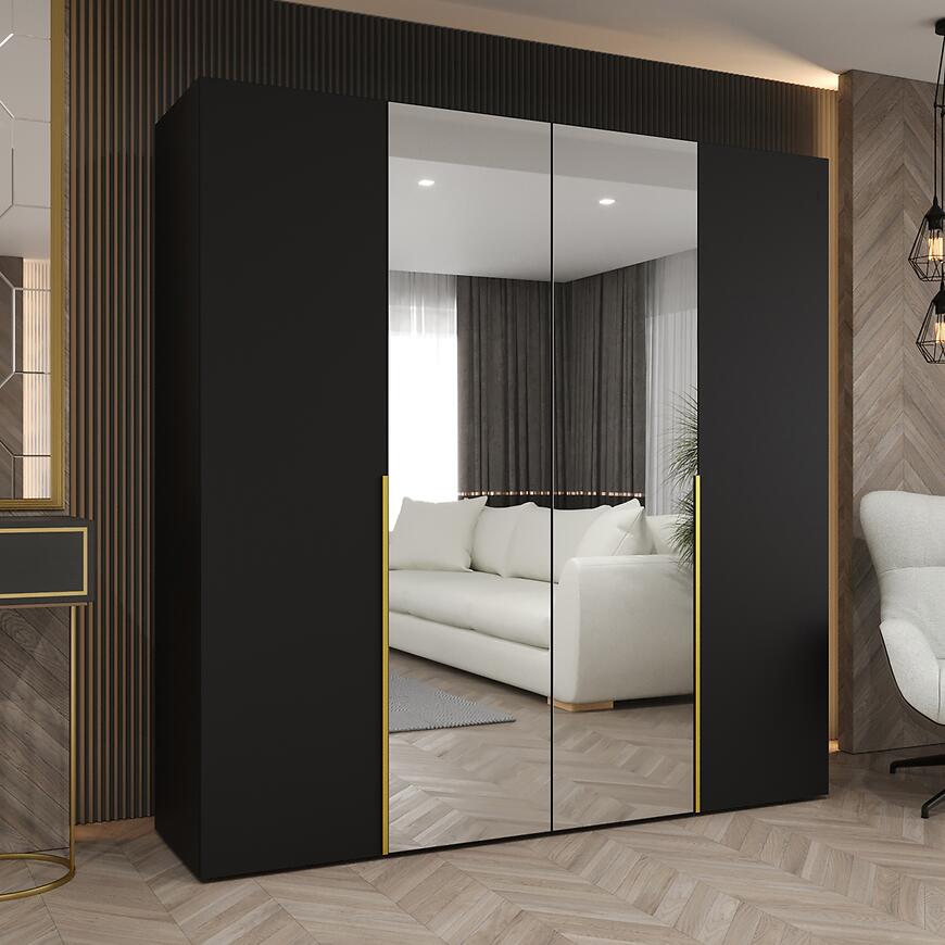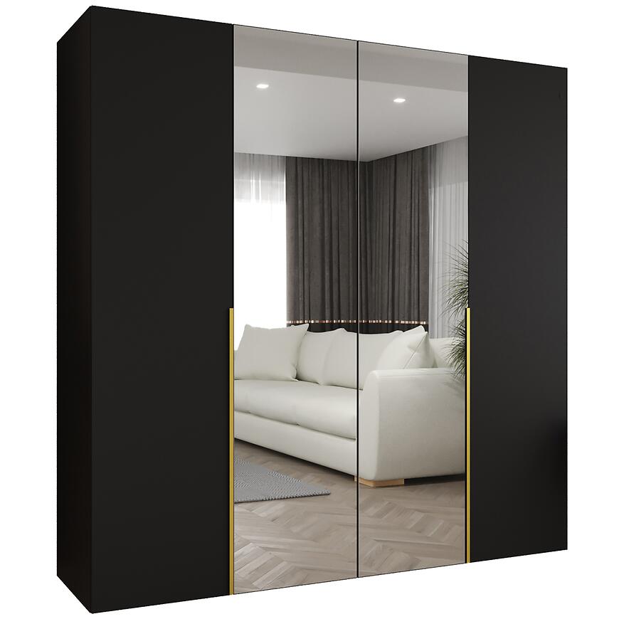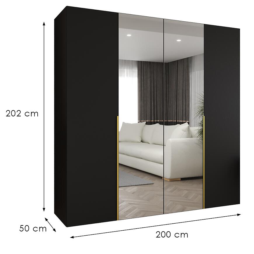 Szafa Alicante II 200 czarny/złoty z kolekcji ALICANTE to propozycja dla osób poszukujących pojemnej, estetycznej i dobrze zaprojektowanej szafy do sypialni, przedpokoju lub garderoby. Szerokość 200 cm, wysokość 202 cm oraz głębokość 50 cm sprawiają, że mebel oferuje dużą przestrzeń do przechowywania ubrań, a jednocześnie nie dominuje wizualnie wnętrza. Prosty kształt i nowoczesny styl czynią tę szafę uniwersalnym elementem aranżacji, który łatwo dopasować do różnych koncepcji wystroju. Obecność lustra na frontach optycznie powiększa pomieszczenie i zwiększa komfort codziennego użytkowania, szczególnie w mniejszych wnętrzach.