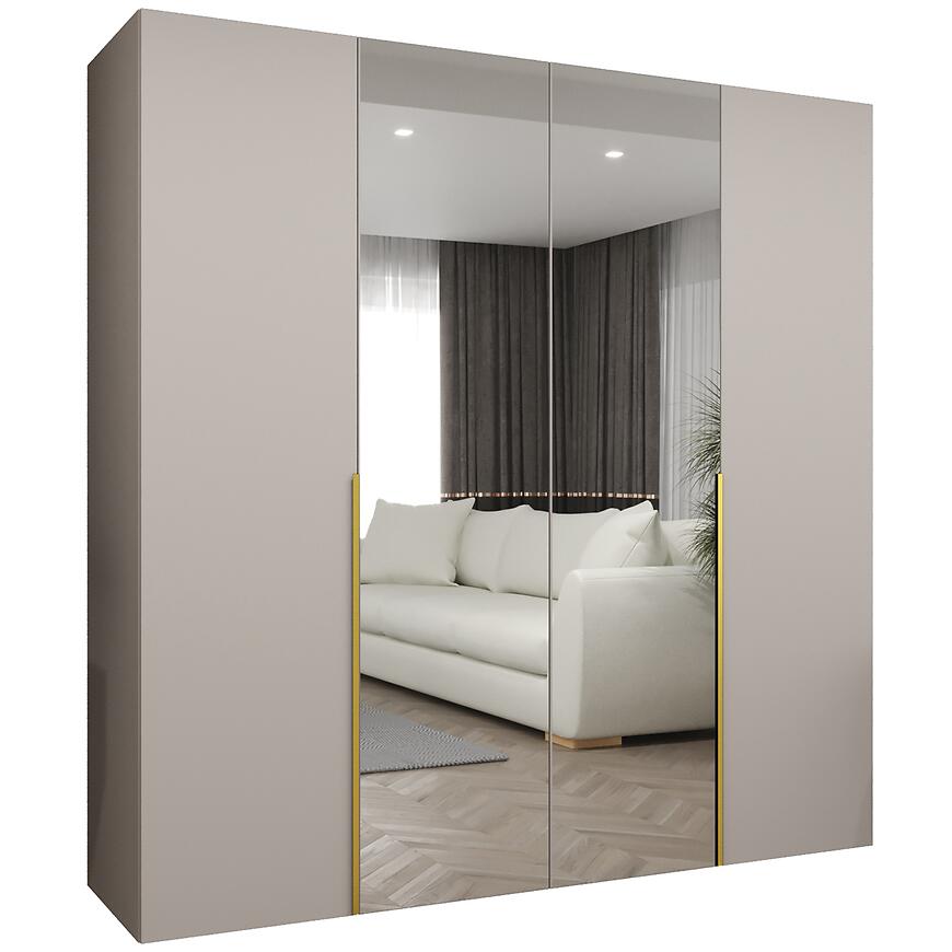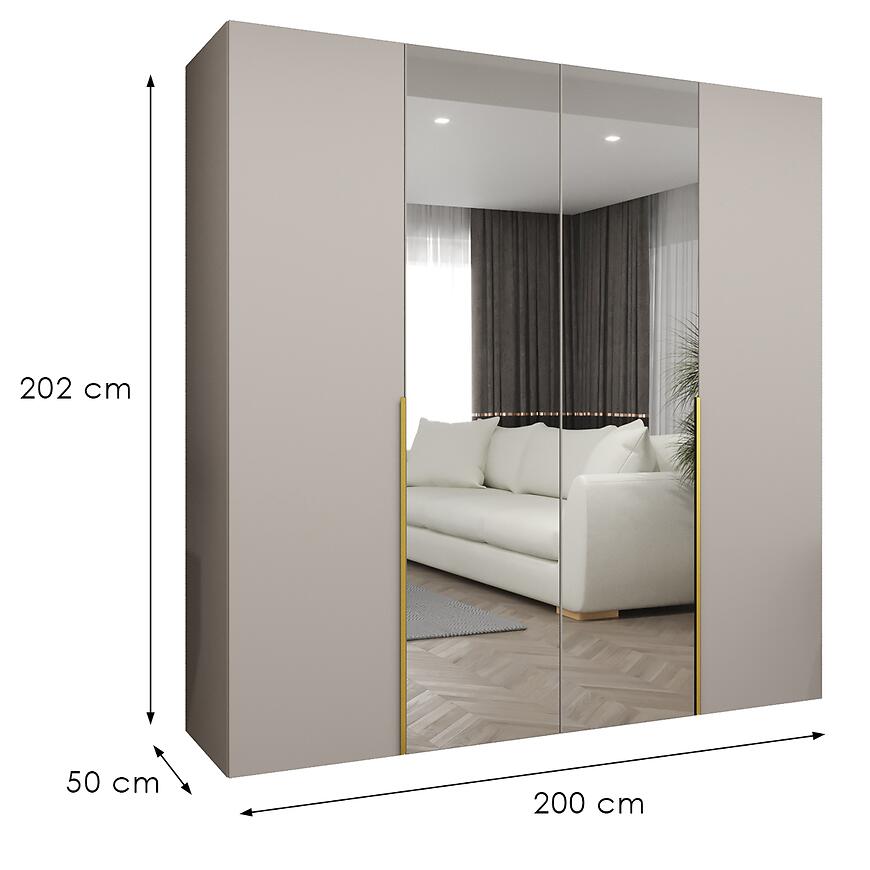 Szafa Alicante II 200 kaszmir/złoty z kolekcji ALICANTE to propozycja dla osób poszukujących pojemnej, estetycznej i dobrze zaprojektowanej szafy do sypialni, przedpokoju lub garderoby. Szerokość 200 cm, wysokość 202 cm oraz głębokość 50 cm sprawiają, że mebel oferuje dużą przestrzeń do przechowywania ubrań, a jednocześnie nie dominuje wizualnie wnętrza. Prosty kształt i nowoczesny styl czynią tę szafę uniwersalnym elementem aranżacji, który łatwo dopasować do różnych koncepcji wystroju. Obecność lustra na frontach optycznie powiększa pomieszczenie i zwiększa komfort codziennego użytkowania, szczególnie w mniejszych wnętrzach.