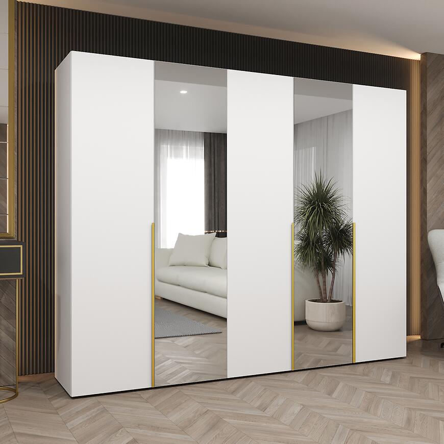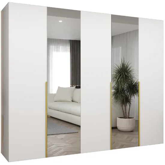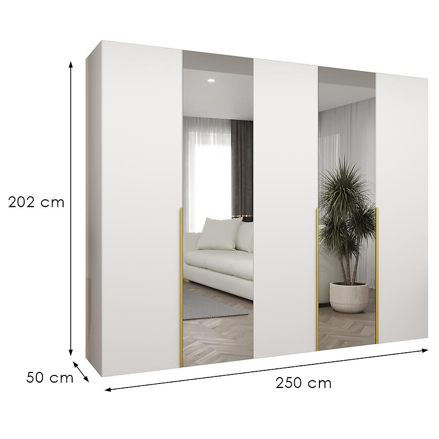 Szafa Alicante II 250 biały/złoty to propozycja dla osób poszukujących pojemnej, estetycznej i trwałej szafy do sypialni, garderoby lub przestronnego przedpokoju. Dzięki szerokości 250 cm mebel zapewnia dużą ilość miejsca do przechowywania ubrań, dodatków oraz tekstyliów domowych, jednocześnie zachowując nowoczesny i uporządkowany wygląd. Prosta bryła oraz klasyczne drzwi sprawiają, że szafa Alicante II 250 doskonale wpisuje się w aktualne trendy aranżacyjne i dobrze komponuje się z innymi meblami w stylu nowoczesnym.