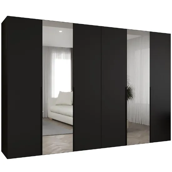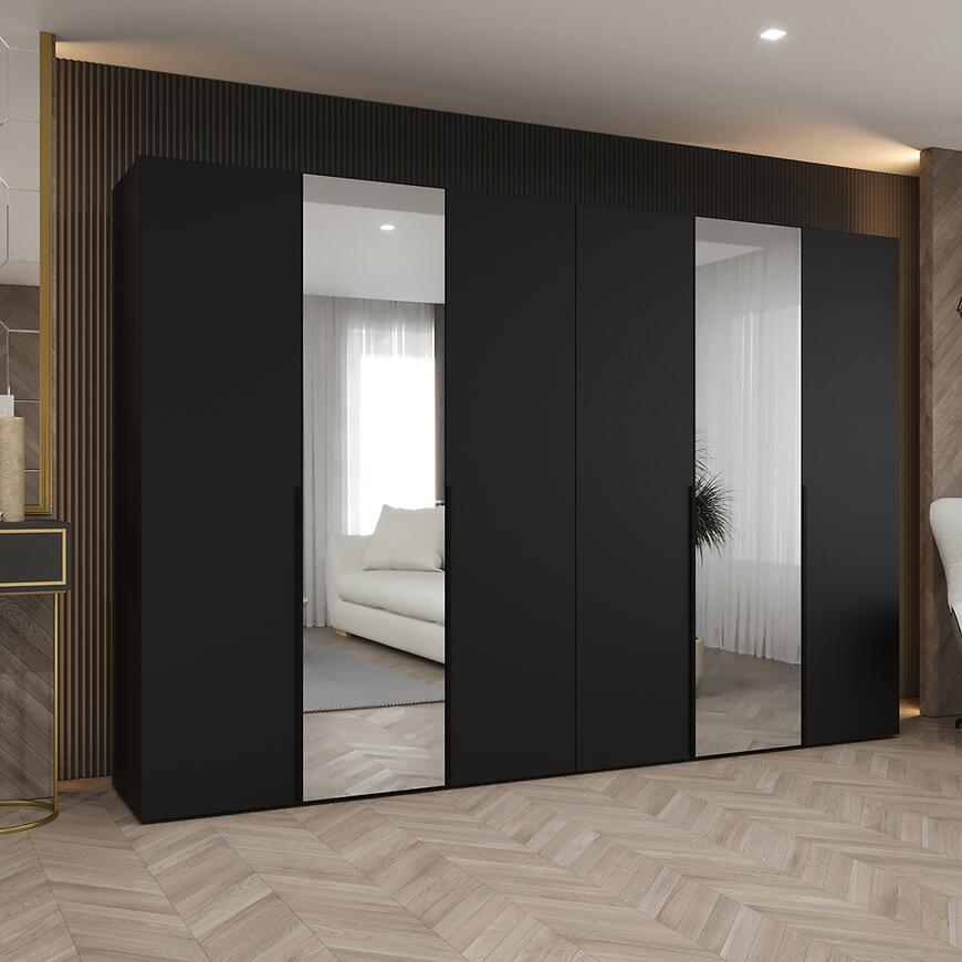 Szafa Alicante II 300 czarny z kolekcji ALICANTE to propozycja dla osób poszukujących dużej, pojemnej i estetycznej szafy do nowoczesnych wnętrz. Szerokość 300 cm sprawia, że model ten doskonale sprawdzi się zarówno w przestronnej sypialni, jak i w garderobie lub dużym przedpokoju. Prosta forma, klasyczne drzwi oraz matowe wykończenie nadają meblowi elegancki wygląd, który łatwo dopasować do różnych aranżacji. Dzięki zastosowaniu lustra szafa Alicante II 300 optycznie powiększa pomieszczenie i zwiększa jego funkcjonalność, co jest szczególnie istotne w codziennym użytkowaniu.