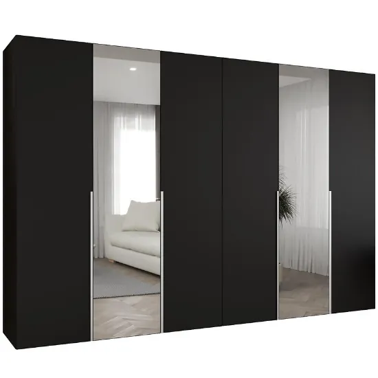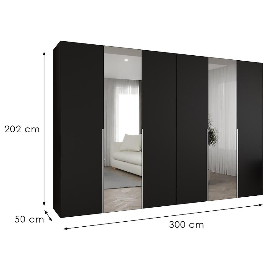 Szafa Alicante II 300 czarny/srebrny z kolekcji ALICANTE to propozycja dla osób poszukujących dużej, pojemnej i estetycznej szafy do nowoczesnych wnętrz. Szerokość 300 cm sprawia, że model ten doskonale sprawdzi się zarówno w przestronnej sypialni, jak i w garderobie lub dużym przedpokoju. Prosta forma, klasyczne drzwi oraz matowe wykończenie nadają meblowi elegancki wygląd, który łatwo dopasować do różnych aranżacji. Dzięki zastosowaniu lustra szafa Alicante II 300 optycznie powiększa pomieszczenie i zwiększa jego funkcjonalność, co jest szczególnie istotne w codziennym użytkowaniu.