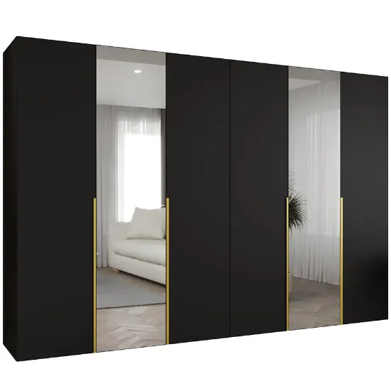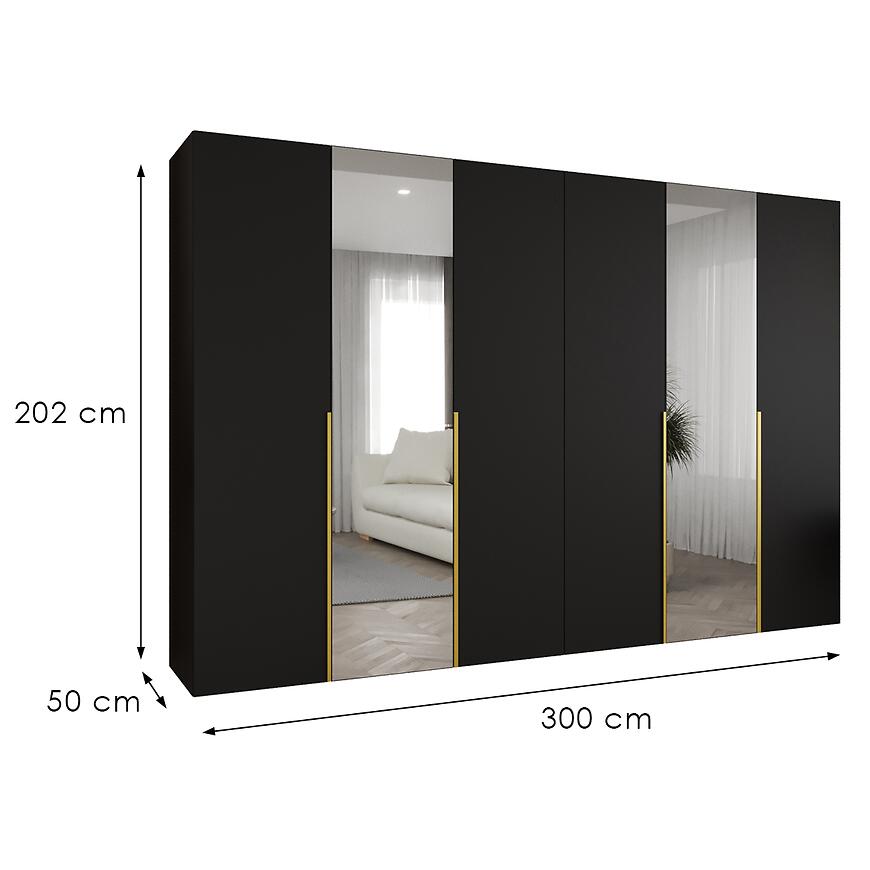 Szafa Alicante II 300 czarny/złoty z kolekcji ALICANTE to propozycja dla osób poszukujących dużej, pojemnej i estetycznej szafy do nowoczesnych wnętrz. Szerokość 300 cm sprawia, że model ten doskonale sprawdzi się zarówno w przestronnej sypialni, jak i w garderobie lub dużym przedpokoju. Prosta forma, klasyczne drzwi oraz matowe wykończenie nadają meblowi elegancki wygląd, który łatwo dopasować do różnych aranżacji. Dzięki zastosowaniu lustra szafa Alicante II 300 optycznie powiększa pomieszczenie i zwiększa jego funkcjonalność, co jest szczególnie istotne w codziennym użytkowaniu.