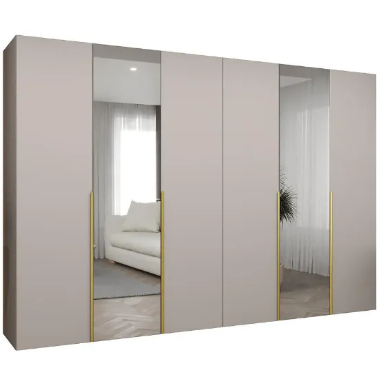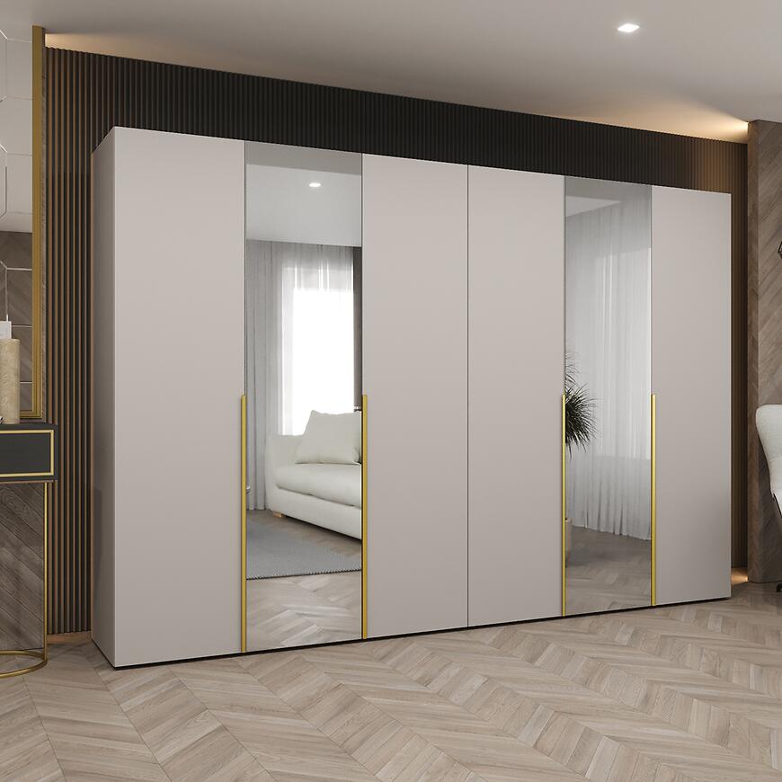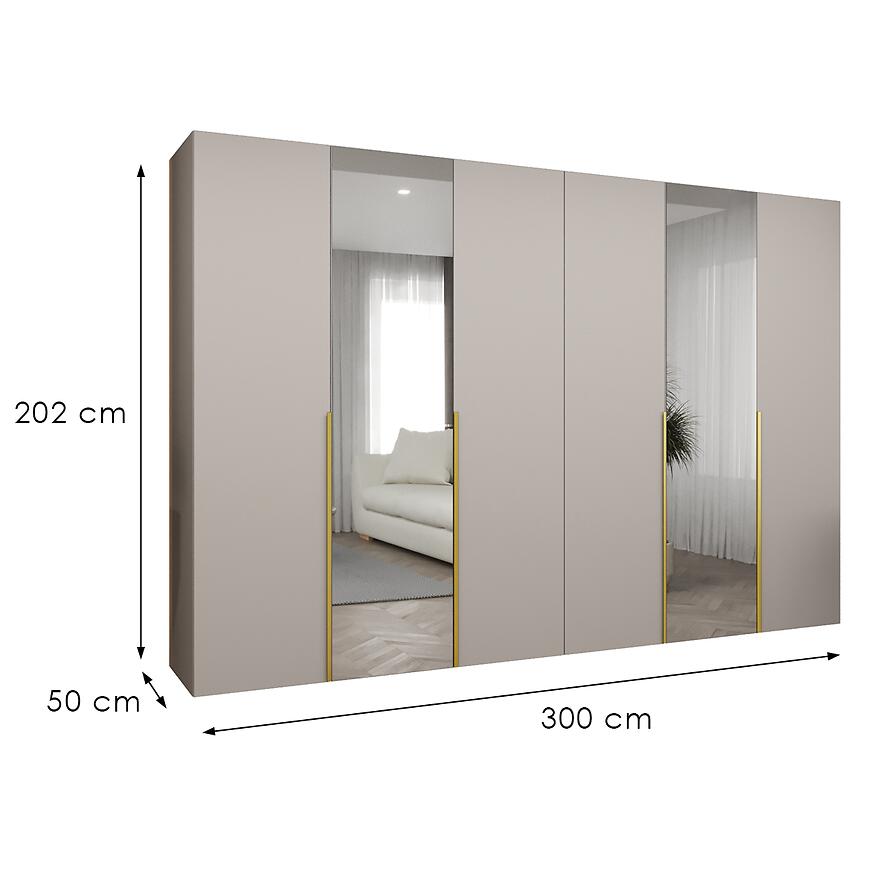 Szafa Alicante II 300 kaszmir/złoty z kolekcji ALICANTE to propozycja dla osób poszukujących dużej, pojemnej i estetycznej szafy do nowoczesnych wnętrz. Szerokość 300 cm sprawia, że model ten doskonale sprawdzi się zarówno w przestronnej sypialni, jak i w garderobie lub dużym przedpokoju. Prosta forma, klasyczne drzwi oraz matowe wykończenie nadają meblowi elegancki wygląd, który łatwo dopasować do różnych aranżacji. Dzięki zastosowaniu lustra szafa Alicante II 300 optycznie powiększa pomieszczenie i zwiększa jego funkcjonalność, co jest szczególnie istotne w codziennym użytkowaniu.