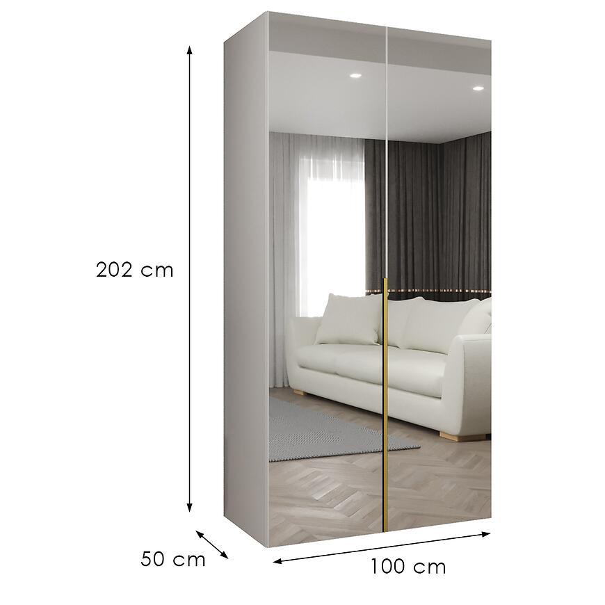 Szafa Alicante III 100 biały/złoty to propozycja dla osób, które poszukują estetycznego i praktycznego mebla do przechowywania ubrań oraz dodatków. Dzięki szerokości 100 cm, wysokości 202 cm i głębokości 50 cm szafa doskonale sprawdzi się zarówno w sypialni, jak i w przedpokoju czy garderobie. Prosta bryła, klasyczne drzwi oraz nowoczesny styl sprawiają, że model z kolekcji ALICANTE łatwo dopasować do wielu aranżacji wnętrz. Zastosowanie lustra na froncie nie tylko podnosi walory wizualne mebla, ale również optycznie powiększa przestrzeń, co jest szczególnie istotne w mniejszych pomieszczeniach.