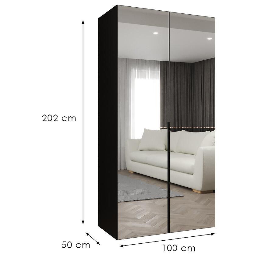 Szafa Alicante III 100 czarny to propozycja dla osób, które poszukują estetycznego i praktycznego mebla do przechowywania ubrań oraz dodatków. Dzięki szerokości 100 cm, wysokości 202 cm i głębokości 50 cm szafa doskonale sprawdzi się zarówno w sypialni, jak i w przedpokoju czy garderobie. Prosta bryła, klasyczne drzwi oraz nowoczesny styl sprawiają, że model z kolekcji ALICANTE łatwo dopasować do wielu aranżacji wnętrz. Zastosowanie lustra na froncie nie tylko podnosi walory wizualne mebla, ale również optycznie powiększa przestrzeń, co jest szczególnie istotne w mniejszych pomieszczeniach.
