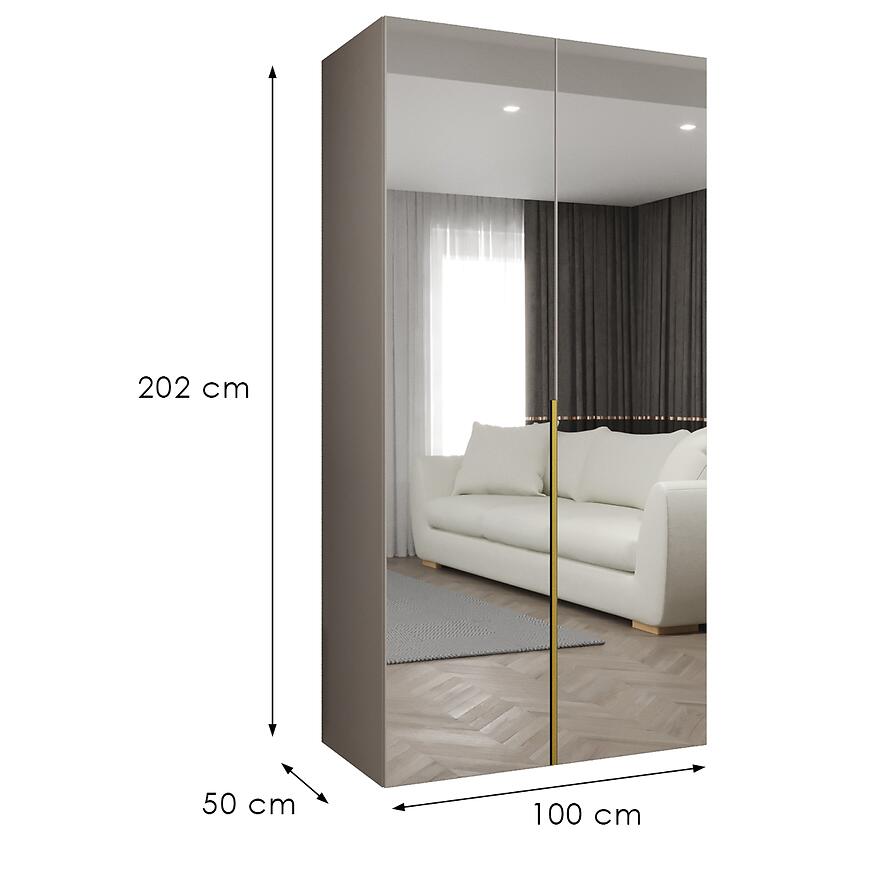 Szafa Alicante III 100 kaszmir/złoty to propozycja dla osób, które poszukują estetycznego i praktycznego mebla do przechowywania ubrań oraz dodatków. Dzięki szerokości 100 cm, wysokości 202 cm i głębokości 50 cm szafa doskonale sprawdzi się zarówno w sypialni, jak i w przedpokoju czy garderobie. Prosta bryła, klasyczne drzwi oraz nowoczesny styl sprawiają, że model z kolekcji ALICANTE łatwo dopasować do wielu aranżacji wnętrz. Zastosowanie lustra na froncie nie tylko podnosi walory wizualne mebla, ale również optycznie powiększa przestrzeń, co jest szczególnie istotne w mniejszych pomieszczeniach.
