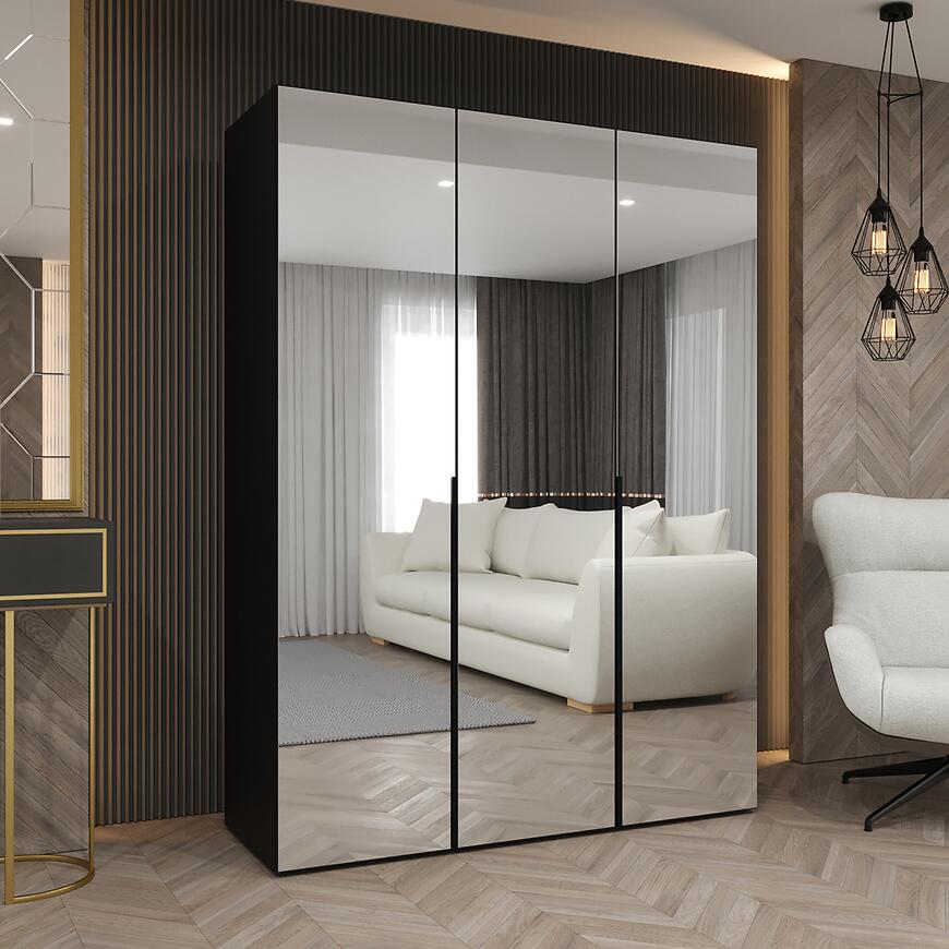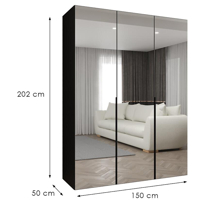 Szafa Alicante III 150 czarny to propozycja dla osób, które szukają połączenia estetyki, praktycznego przechowywania i spójnego designu wnętrza. Ten model z kolekcji ALICANTE doskonale wpisuje się w nowoczesne aranżacje sypialni, garderoby oraz przedpokoju. Prosty kształt, matowe wykończenie i klasyczne drzwi sprawiają, że szafa prezentuje się elegancko i harmonijnie, nie dominując przestrzeni. Szerokość 150 cm, wysokość 202 cm oraz głębokość 50 cm zapewniają dużą pojemność przy zachowaniu kompaktowej formy, co czyni ją idealnym wyborem także do mieszkań o ograniczonym metrażu. Obecność lustra na froncie zwiększa komfort codziennego użytkowania i optycznie powiększa pomieszczenie, co jest szczególnie istotne w mniejszych wnętrzach.