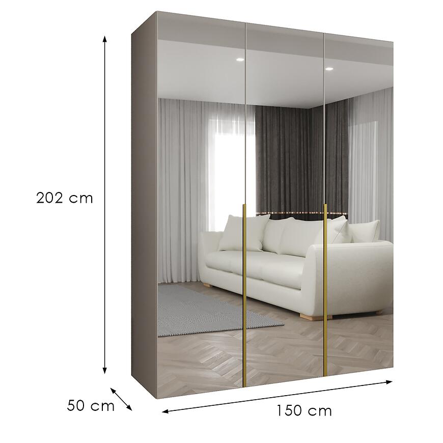 Szafa Alicante III 150 kaszmir/złoty to propozycja dla osób, które szukają połączenia estetyki, praktycznego przechowywania i spójnego designu wnętrza. Ten model z kolekcji ALICANTE doskonale wpisuje się w nowoczesne aranżacje sypialni, garderoby oraz przedpokoju. Prosty kształt, matowe wykończenie i klasyczne drzwi sprawiają, że szafa prezentuje się elegancko i harmonijnie, nie dominując przestrzeni. Szerokość 150 cm, wysokość 202 cm oraz głębokość 50 cm zapewniają dużą pojemność przy zachowaniu kompaktowej formy, co czyni ją idealnym wyborem także do mieszkań o ograniczonym metrażu. Obecność lustra na froncie zwiększa komfort codziennego użytkowania i optycznie powiększa pomieszczenie, co jest szczególnie istotne w mniejszych wnętrzach.