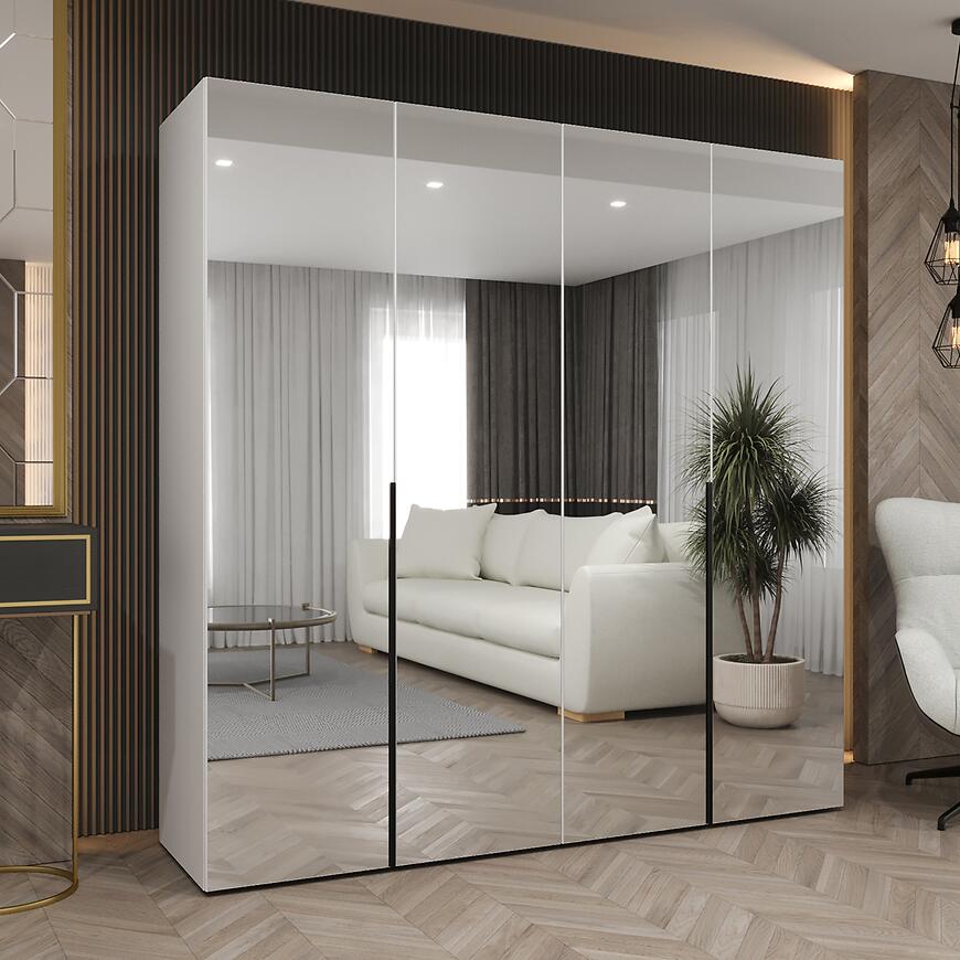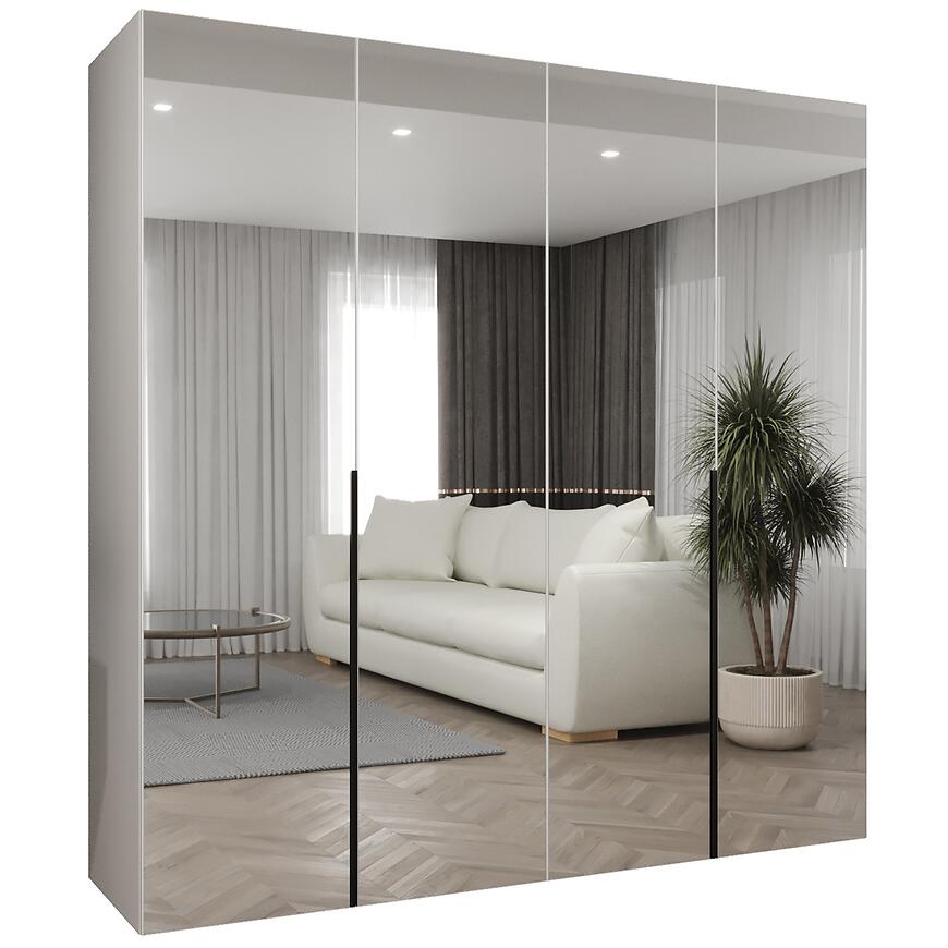 Szafa Alicante III 200 biały/czarny to propozycja dla osób poszukujących pojemnej i estetycznej szafy do sypialni, garderoby lub przestronnego przedpokoju. Model o szerokości 200 cm, wysokości 202 cm i głębokości 50 cm został zaprojektowany z myślą o maksymalnym wykorzystaniu przestrzeni przy zachowaniu nowoczesnej formy. Prosty kształt bryły sprawia, że szafa Alicante III 200 dobrze komponuje się zarówno z minimalistycznymi, jak i bardziej rozbudowanymi aranżacjami wnętrz. Czterodrzwiowa konstrukcja ułatwia organizację odzieży, a lustro umieszczone na froncie optycznie powiększa pomieszczenie i zwiększa jego funkcjonalność.