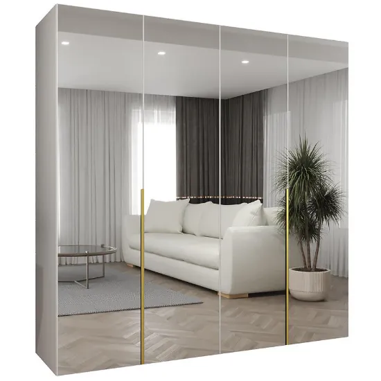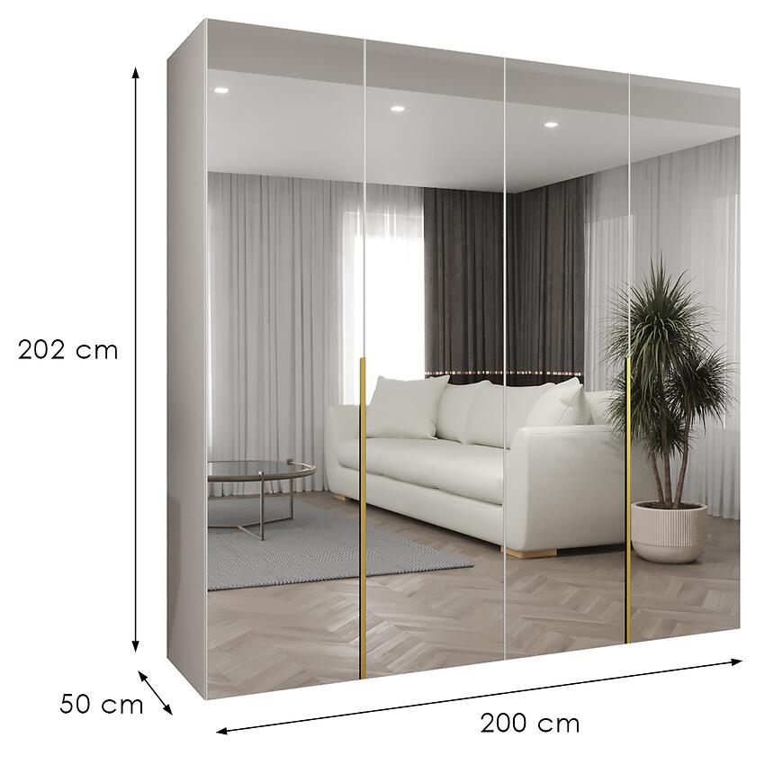 Szafa Alicante III 200 biały/złoty to propozycja dla osób poszukujących pojemnej i estetycznej szafy do sypialni, garderoby lub przestronnego przedpokoju. Model o szerokości 200 cm, wysokości 202 cm i głębokości 50 cm został zaprojektowany z myślą o maksymalnym wykorzystaniu przestrzeni przy zachowaniu nowoczesnej formy. Prosty kształt bryły sprawia, że szafa Alicante III 200 dobrze komponuje się zarówno z minimalistycznymi, jak i bardziej rozbudowanymi aranżacjami wnętrz. Czterodrzwiowa konstrukcja ułatwia organizację odzieży, a lustro umieszczone na froncie optycznie powiększa pomieszczenie i zwiększa jego funkcjonalność.
