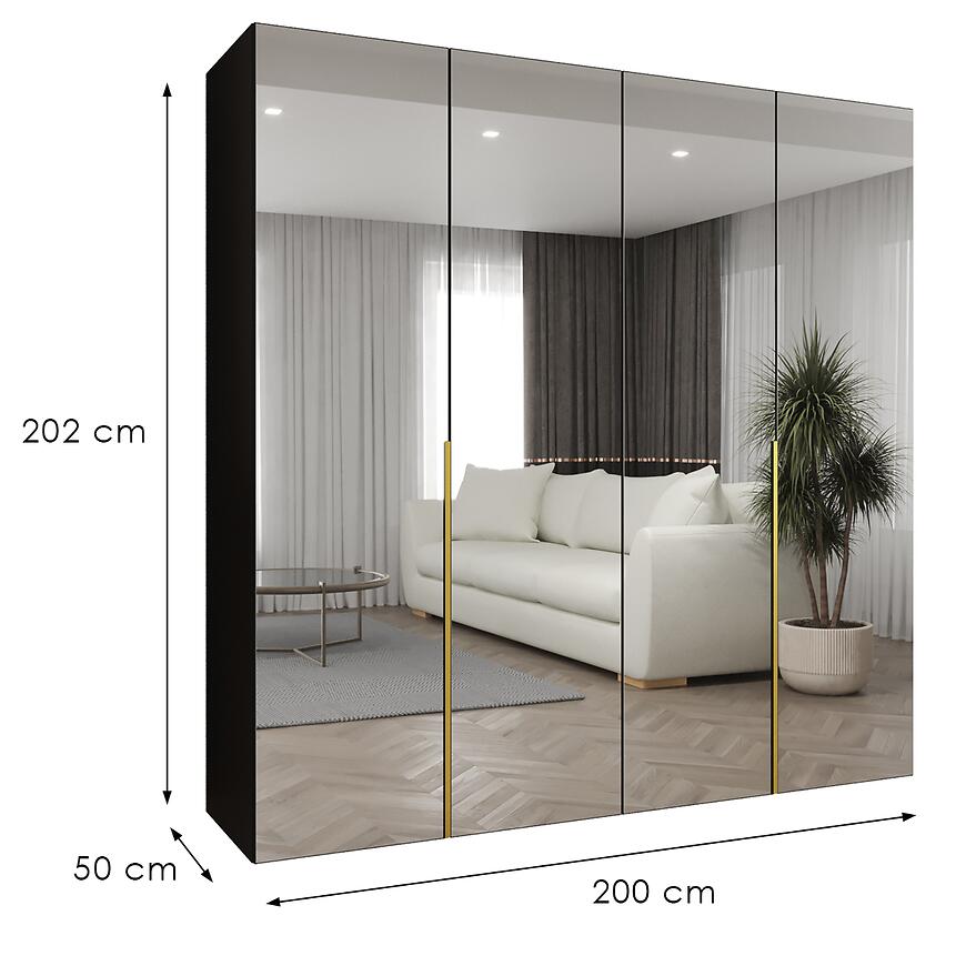 Szafa Alicante III 200 czarny/złoty to propozycja dla osób poszukujących pojemnej i estetycznej szafy do sypialni, garderoby lub przestronnego przedpokoju. Model o szerokości 200 cm, wysokości 202 cm i głębokości 50 cm został zaprojektowany z myślą o maksymalnym wykorzystaniu przestrzeni przy zachowaniu nowoczesnej formy. Prosty kształt bryły sprawia, że szafa Alicante III 200 dobrze komponuje się zarówno z minimalistycznymi, jak i bardziej rozbudowanymi aranżacjami wnętrz. Czterodrzwiowa konstrukcja ułatwia organizację odzieży, a lustro umieszczone na froncie optycznie powiększa pomieszczenie i zwiększa jego funkcjonalność.