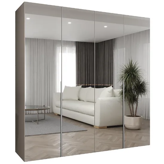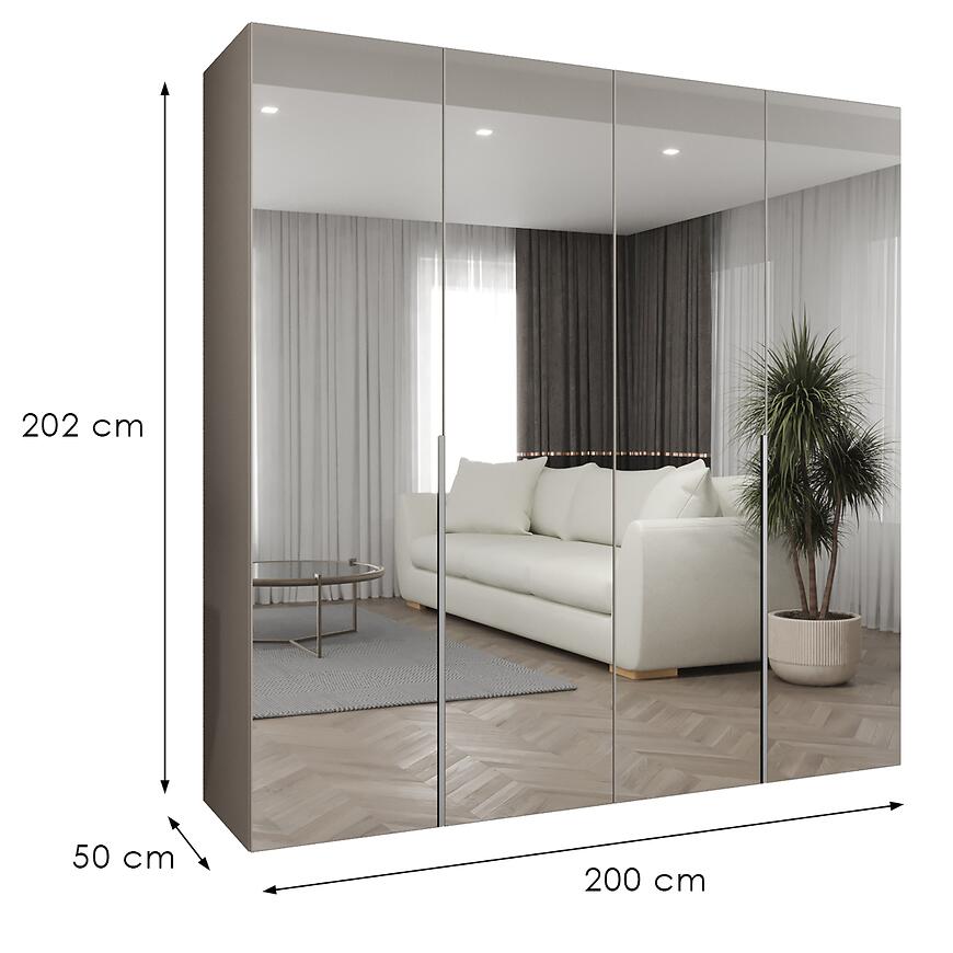 Szafa Alicante III 200 kaszmir/srebrny to propozycja dla osób poszukujących pojemnej i estetycznej szafy do sypialni, garderoby lub przestronnego przedpokoju. Model o szerokości 200 cm, wysokości 202 cm i głębokości 50 cm został zaprojektowany z myślą o maksymalnym wykorzystaniu przestrzeni przy zachowaniu nowoczesnej formy. Prosty kształt bryły sprawia, że szafa Alicante III 200 dobrze komponuje się zarówno z minimalistycznymi, jak i bardziej rozbudowanymi aranżacjami wnętrz. Czterodrzwiowa konstrukcja ułatwia organizację odzieży, a lustro umieszczone na froncie optycznie powiększa pomieszczenie i zwiększa jego funkcjonalność.