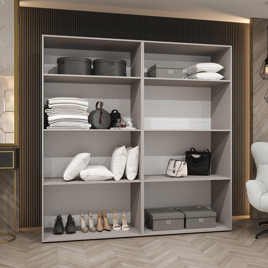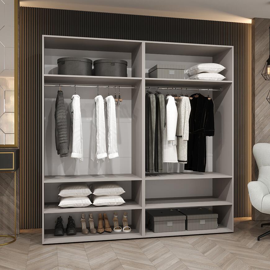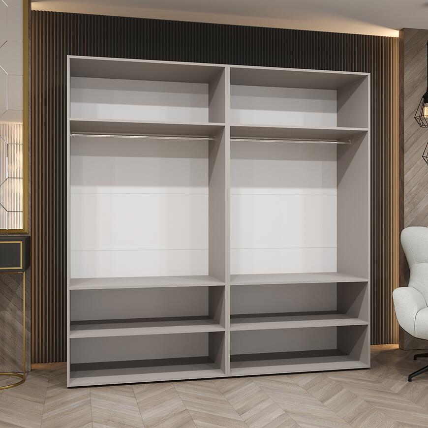 Szafy z lustrem cieszą się dużą popularnością ze względu na swoją użyteczność. W modelu Alicante III 200 lustro pełni funkcję zarówno dekoracyjną, jak i praktyczną. Ułatwia codzienne korzystanie z garderoby, a jednocześnie rozjaśnia i wizualnie powiększa przestrzeń. Matowe wykończenie frontów w połączeniu z lustrem tworzy spójną i nowoczesną całość, która wpisuje się w aktualne trendy aranżacyjne.