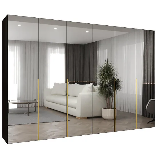 Szafa Alicante III 300 czarny/złoty to propozycja dla osób, które poszukują dużej, eleganckiej i praktycznej szafy do sypialni, garderoby lub przestronnego przedpokoju. Szerokość 300 cm zapewnia bardzo dużą pojemność, dzięki czemu bez trudu pomieści odzież codzienną, sezonową oraz dodatki. Nowoczesny styl i prosta forma sprawiają, że szafa Alicante III 300 harmonijnie wpisuje się w aktualne trendy aranżacyjne, jednocześnie zachowując uniwersalny charakter, który łatwo dopasować do różnych wnętrz. Matowe wykończenie frontów podkreśla estetykę mebla i nadaje mu spokojny, elegancki wygląd, który dobrze prezentuje się zarówno w jasnych, jak i ciemniejszych aranżacjach.