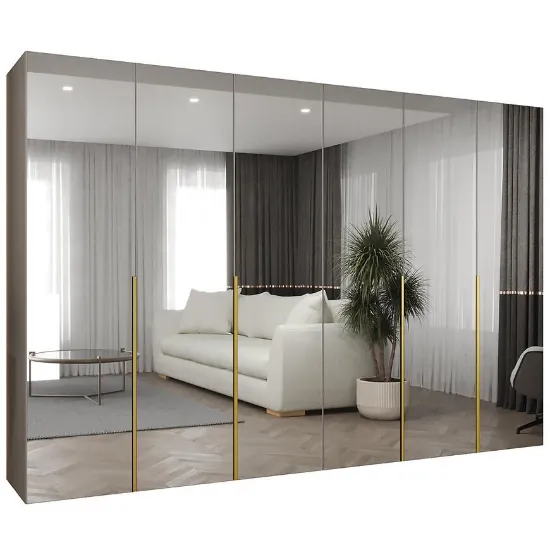 Szafa Alicante III 300 kaszmir/złoty to propozycja dla osób, które poszukują dużej, eleganckiej i praktycznej szafy do sypialni, garderoby lub przestronnego przedpokoju. Szerokość 300 cm zapewnia bardzo dużą pojemność, dzięki czemu bez trudu pomieści odzież codzienną, sezonową oraz dodatki. Nowoczesny styl i prosta forma sprawiają, że szafa Alicante III 300 harmonijnie wpisuje się w aktualne trendy aranżacyjne, jednocześnie zachowując uniwersalny charakter, który łatwo dopasować do różnych wnętrz. Matowe wykończenie frontów podkreśla estetykę mebla i nadaje mu spokojny, elegancki wygląd, który dobrze prezentuje się zarówno w jasnych, jak i ciemniejszych aranżacjach.