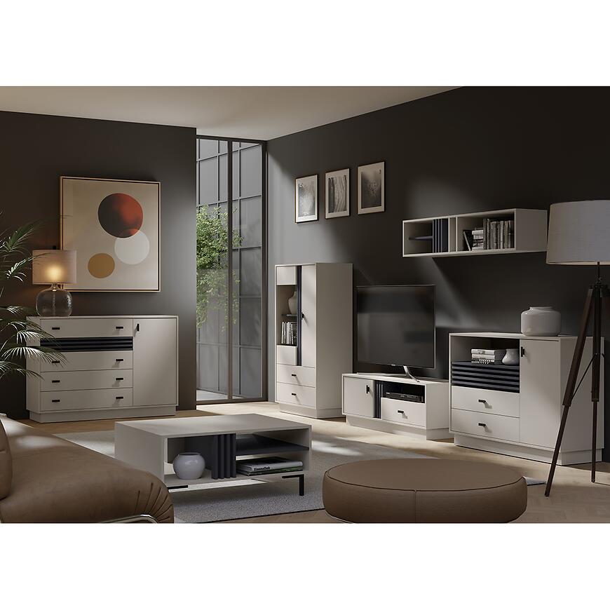 Fronty i korpus wykonano z laminowanej płyty wiórowej, wykończonej matowym laminatem w odcieniu cashmere, co nadaje szafie subtelny, ciepły wygląd beżu. Prosta, nowoczesna forma łączy elegancję z minimalistycznym stylem, wprowadzając harmonijną i przytulną atmosferę.