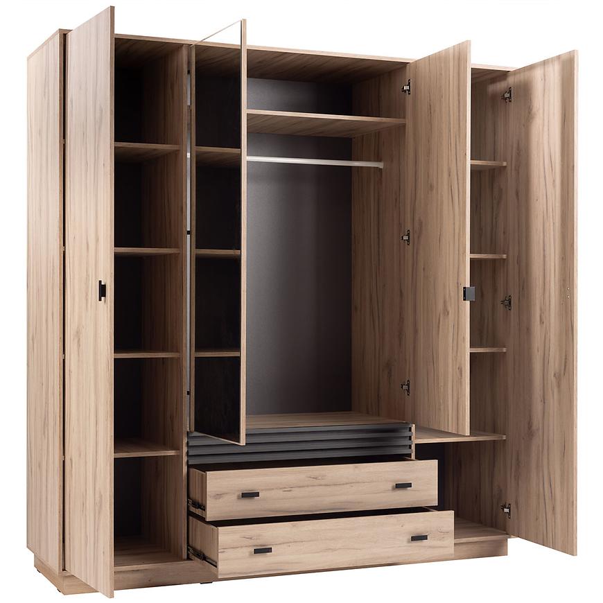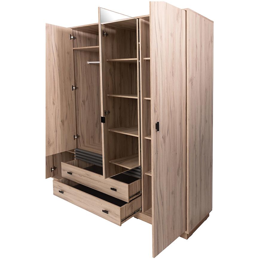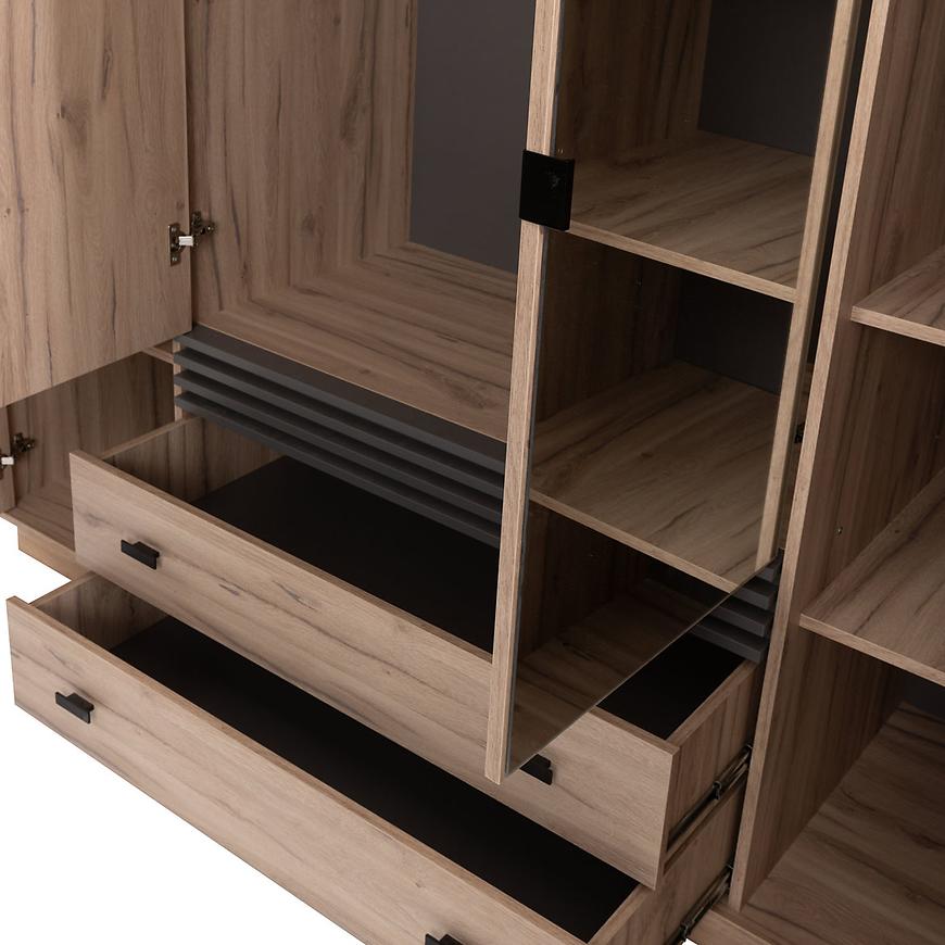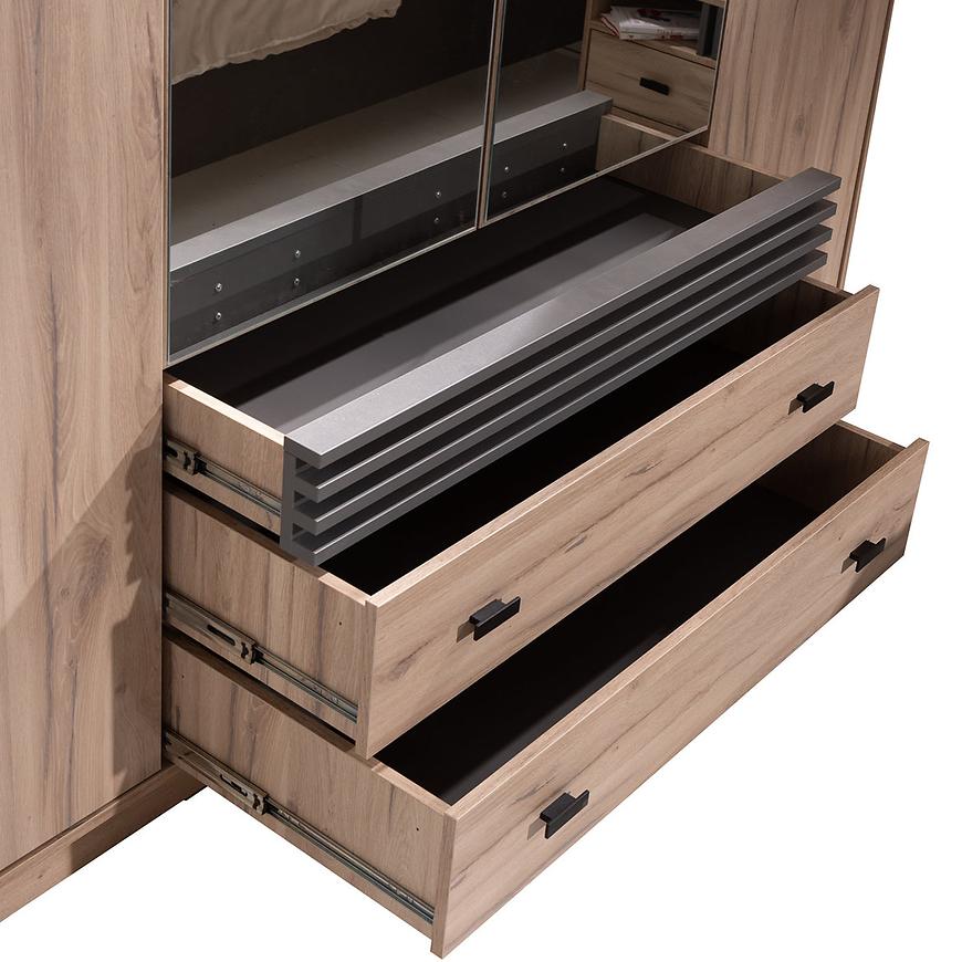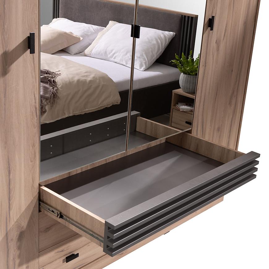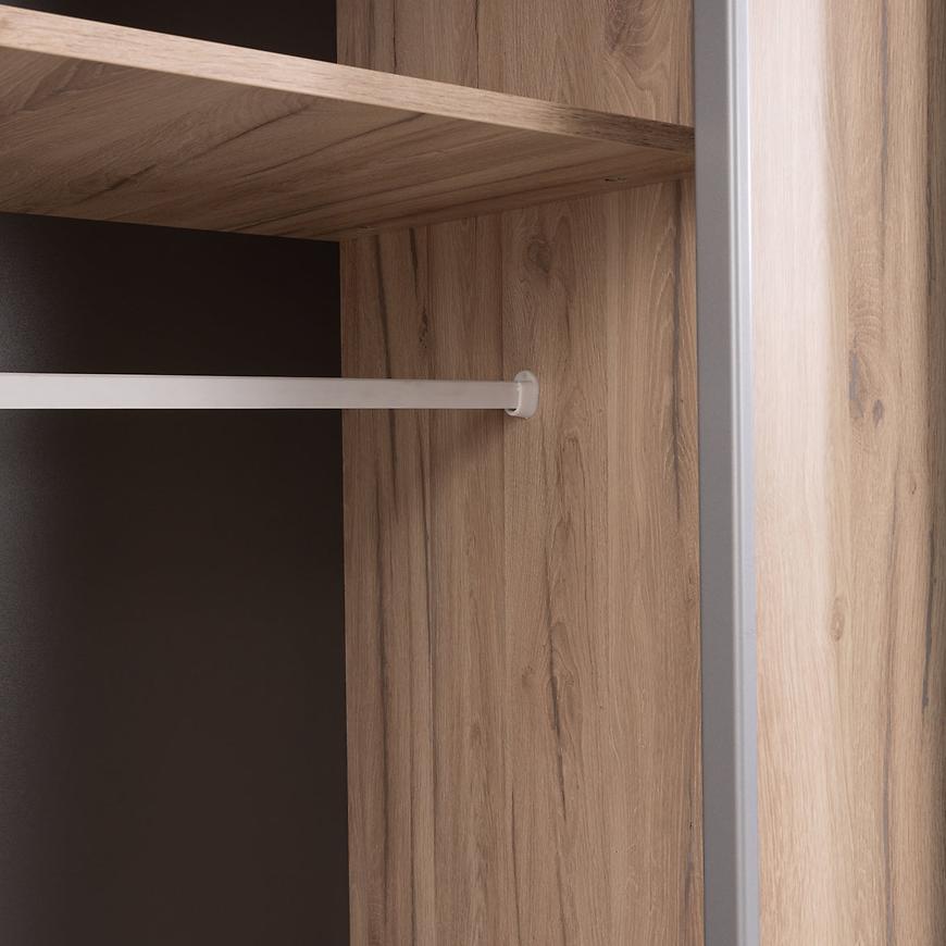 Szafa Allmo w kolorze dąb estana jasny/antracyt to propozycja do pokoju, ale znajdzie swoje miejsce również w innym pomieszczeniu, jak na przykład - przedpokój czy garderoba. Materiał wykonania to płyta wiórowa laminowana. Nowoczesny styl mebli wpadnie do gustu każdemu, kto poszukuje eleganckiego, klasycznego, a zarazem nowoczesnego umeblowania. Idealnie wpasuje się w większość aranżacji. Lustro na drzwiach szafy może sprawić, że pomieszczenie wydaje się większe, co jest szczególnie przydatne w mniejszych pokojach. Przeznaczona do samodzielnego montażu.