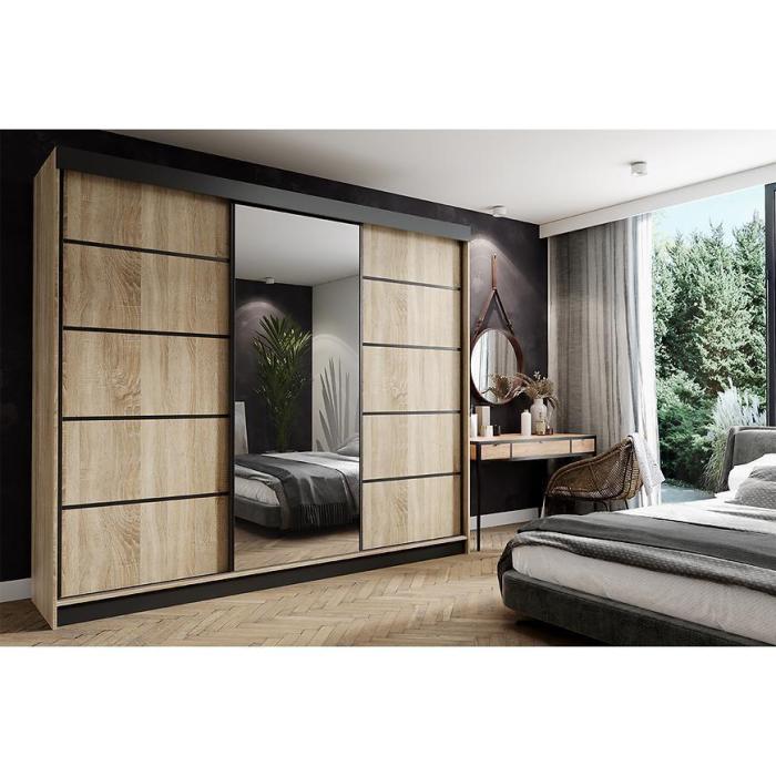 Szafa przesuwna w kolorze dąb sonoma to propozycja do pokoju dziennego, ale znajdzie swoje miejsce również w innym pomieszczeniu, jak na przykład - przedpokój czy garderobie. Materiał wykonania to płyta laminowana. Szafa posiada półki oraz drążek na ubrania. Mebel posiada lustro, które sprawi, że pomieszczenie stanie się optycznie większe. Nowoczesny styl mebli wpadnie do gustu każdemu, kto poszukuje eleganckiego, klasycznego, a zarazem nowoczesnego umeblowania. Idealnie wpasuje się w większość aranżacji. Przeznaczona do samodzielnego montażu. Mebel do samodzielnego montażu.