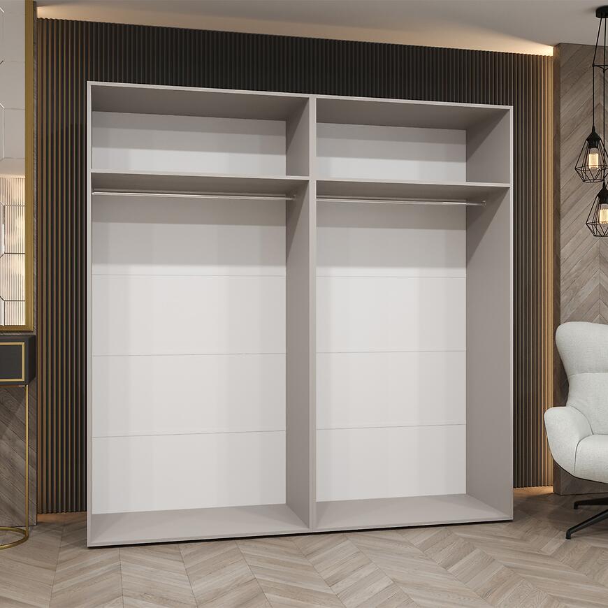 Szafa Andrew 1-200 w kolorze biały/kaszmir to przestronna i praktyczna szafa ubraniowa zaprojektowana z myślą o osobach, które cenią estetykę, trwałość oraz wygodną organizację odzieży. Model z kolekcji ANDREW wyróżnia się nowoczesnym stylem, prostą bryłą oraz uniwersalnym designem, dzięki czemu doskonale komponuje się zarówno z aranżacją sypialni, garderoby, jak i przedpokoju. Szerokość 200 cm zapewnia dużą przestrzeń do przechowywania, pozwalając na uporządkowanie ubrań, dodatków oraz tekstyliów domowych. Szafa wielodrzwiowa z klasycznymi drzwiami świetnie sprawdzi się w pomieszczeniach urządzonych w stylu nowoczesnym, minimalistycznym oraz skandynawskim.