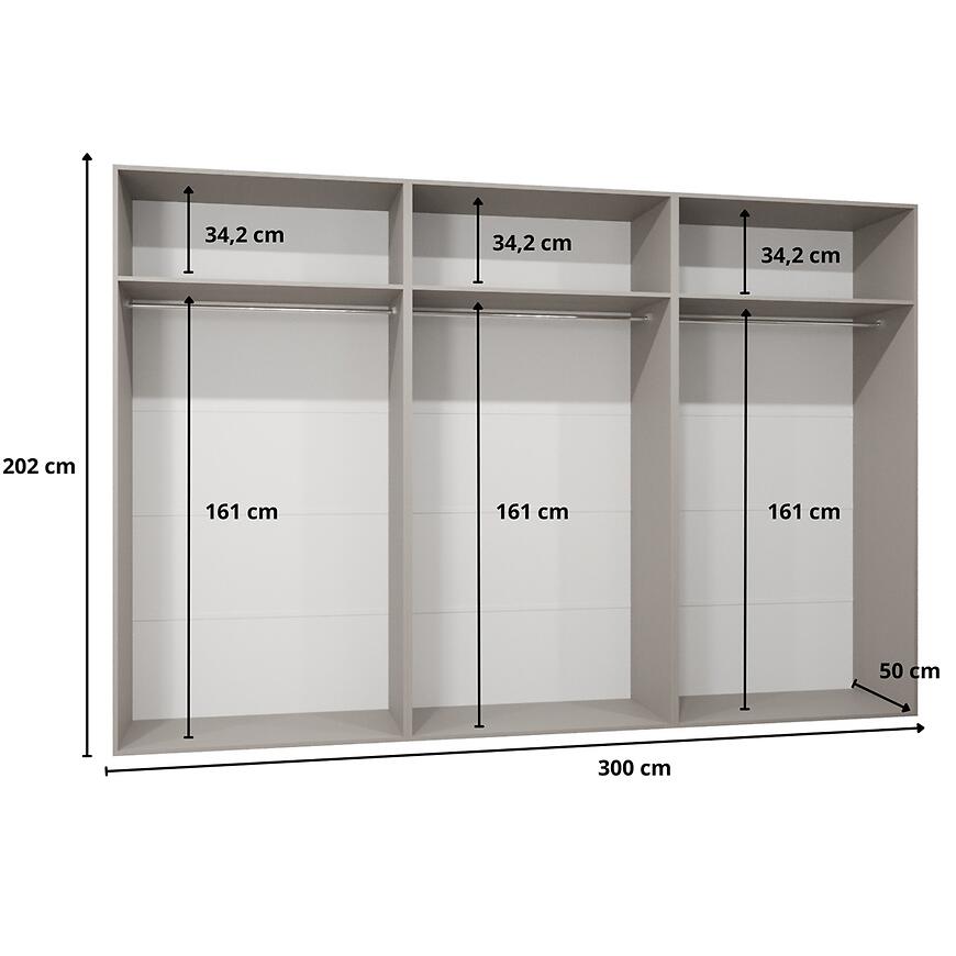 Szafa Andrew 1-300 posiada szerokość 300 cm, wysokość 202 cm oraz głębokość 52 cm, co zapewnia dużą przestrzeń przechowywania. Waga mebla wynosi 204 kg, co świadczy o jego solidnej konstrukcji. Szafa dostarczana jest w elementach i wymaga samodzielnego montażu, co umożliwia wygodne wniesienie mebla do pomieszczenia oraz jego bezpieczne złożenie. Stabilna konstrukcja oraz staranne wykonanie sprawiają, że szafa ubraniowa zachowuje estetykę i funkcjonalność przez długi czas.