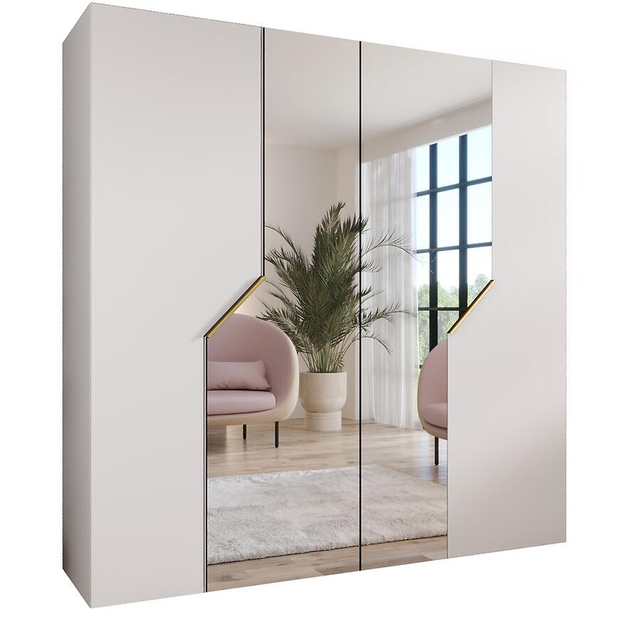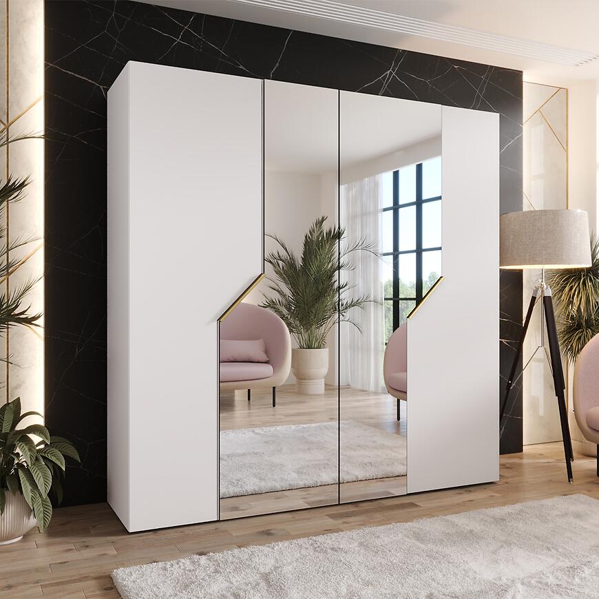 Fronty i korpus szafy Andrew 2-200 wykończone matową powłoką, tworzą harmonijną i elegancką powierzchnię odporną na zarysowania. Białe fronty w połączeniu z wbudowanym lustrem wprowadzają do wnętrza poczucie lekkości i świeżości. Lustro nie tylko pełni funkcję użytkową, ale również optycznie powiększa przestrzeń, co jest szczególnie korzystne w mniejszych pokojach czy garderobach.