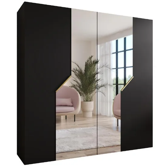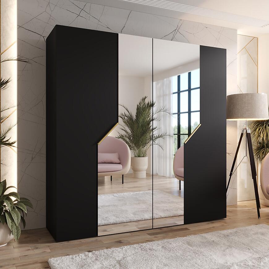 Czarne fronty i korpus wykończone matową powłoką tworzą nowoczesną i elegancką powierzchnię odporną na zarysowania. Wbudowane lustro nie tylko pełni funkcję użytkową, ale również optycznie powiększa przestrzeń, co jest szczególnie korzystne w mniejszych pokojach czy garderobach. Połączenie matowej czerni i lustra wprowadza do wnętrza wyrafinowaną i stylową estetykę.