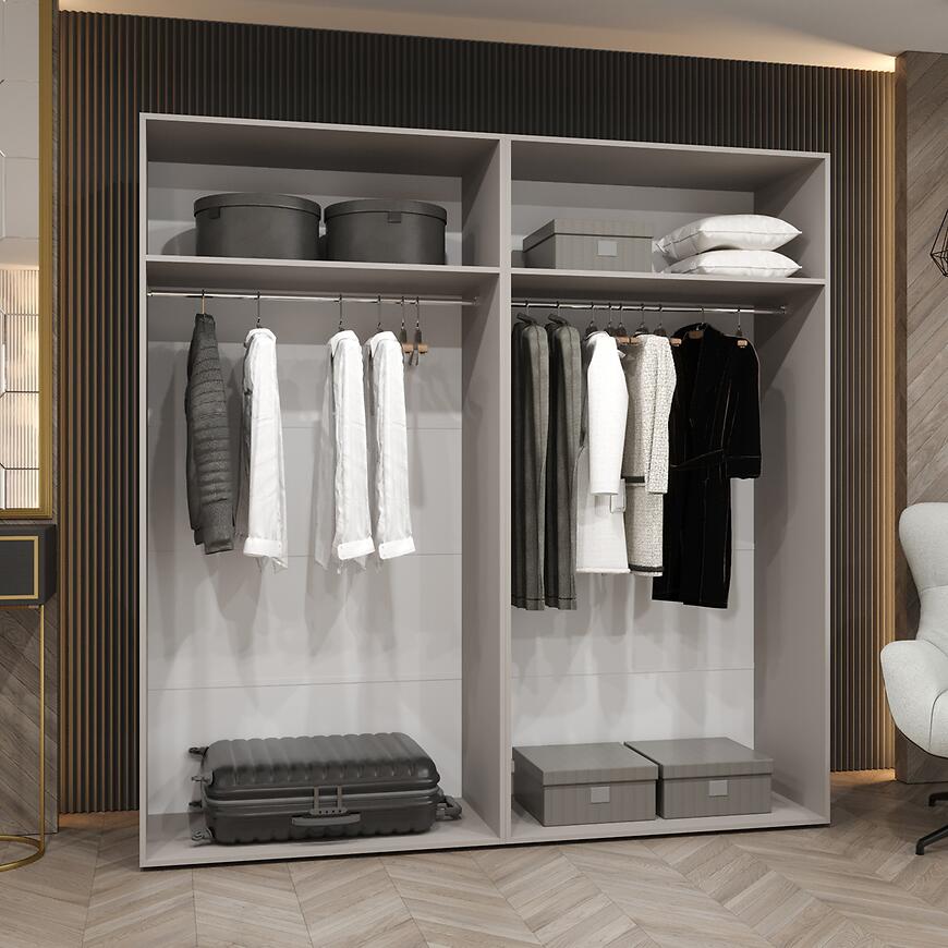 Szafa Andrew 2-200 została wyposażona w dwie pojemne półki oraz drążki na ubrania, umożliwiając wygodne przechowywanie zarówno odzieży wiszącej, jak i złożonej. Konstrukcja frontów z płyty laminowanej i korpusu z płyty wiórowej laminowanej gwarantuje trwałość i odporność na uszkodzenia, dzięki czemu szafa zachowuje estetyczny wygląd przez wiele lat. Montaż jest prosty, a waga 136 kg zapewnia stabilność i solidność mebla.