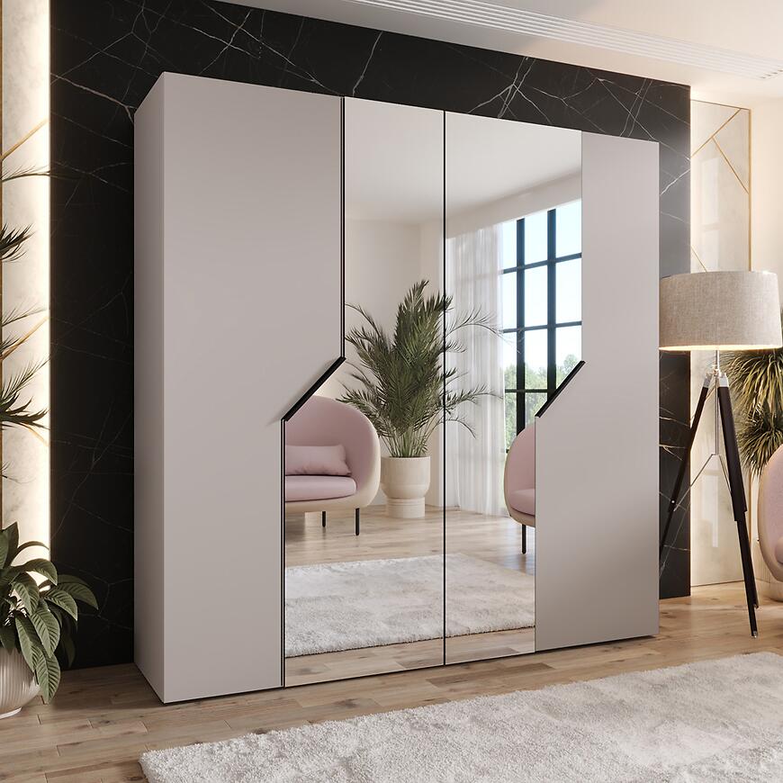 Szafa Andrew 2-200 w kolorze kaszmir to połączenie funkcjonalności i nowoczesnej estetyki. Jej uniwersalny design i praktyczne wnętrze sprawiają, że przechowywanie ubrań staje się wygodne i uporządkowane. Matowy odcień kaszmir w połączeniu z lustrem wprowadza do wnętrza poczucie elega