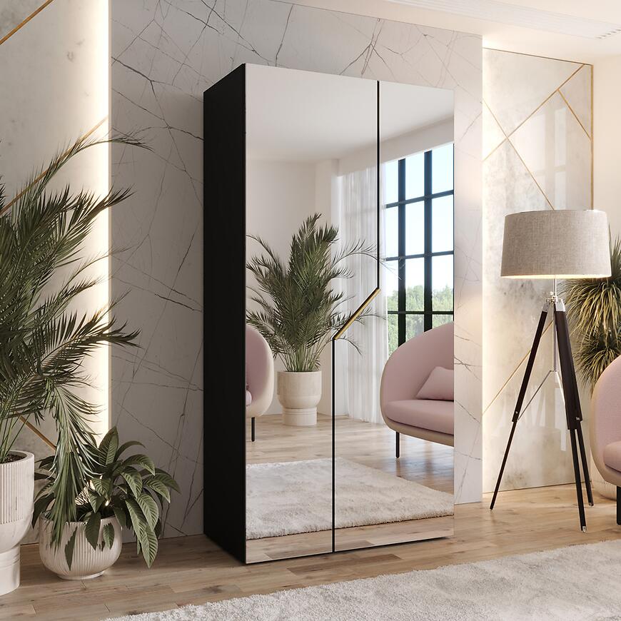 Szafa Andrew 3-100 czarny/złoty to elegancka i praktyczna szafa dwudrzwiowa zaprojektowana z myślą o nowoczesnych aranżacjach wnętrz. Model z kolekcji ANDREW wyróżnia się minimalistyczną formą oraz dużym lustrem pokrywającym całą powierzchnię frontu, co nadaje meblowi stylowy i luksusowy charakter. Takie rozwiązanie sprawia, że szafa z lustrem nie tylko spełnia funkcję przechowywania garderoby, ale także staje się dekoracyjnym elementem wyposażenia.