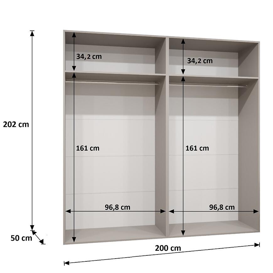 Wnętrze szafy zostało zaprojektowane z myślą o maksymalnej funkcjonalności przestrzeni do przechowywania. Model wyposażono w dwie praktyczne półki oraz drążki na ubrania, które umożliwiają wygodne zawieszenie koszul, marynarek, sukienek czy płaszczy. Taki układ wnętrza pozwala zachować porządek w garderobie i ułatwia segregację odzieży. Pojemna szafa ubraniowa sprawdzi się zarówno w sypialni, jak i w pokoju dziennym, zapewniając komfort przechowywania nawet większej liczby ubrań.