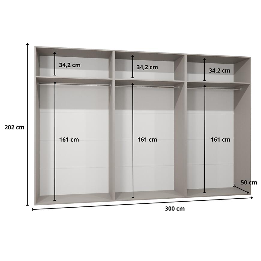 Wnętrze szafy Andrew 3-300 zaprojektowano z myślą o praktycznym przechowywaniu odzieży. Mebel posiada trzy funkcjonalne półki, które umożliwiają wygodne układanie ubrań złożonych czy dodatków tekstylnych. Dodatkowo zastosowano drążki na ubrania, pozwalające na swobodne zawieszenie koszul, sukienek, marynarek i płaszczy.