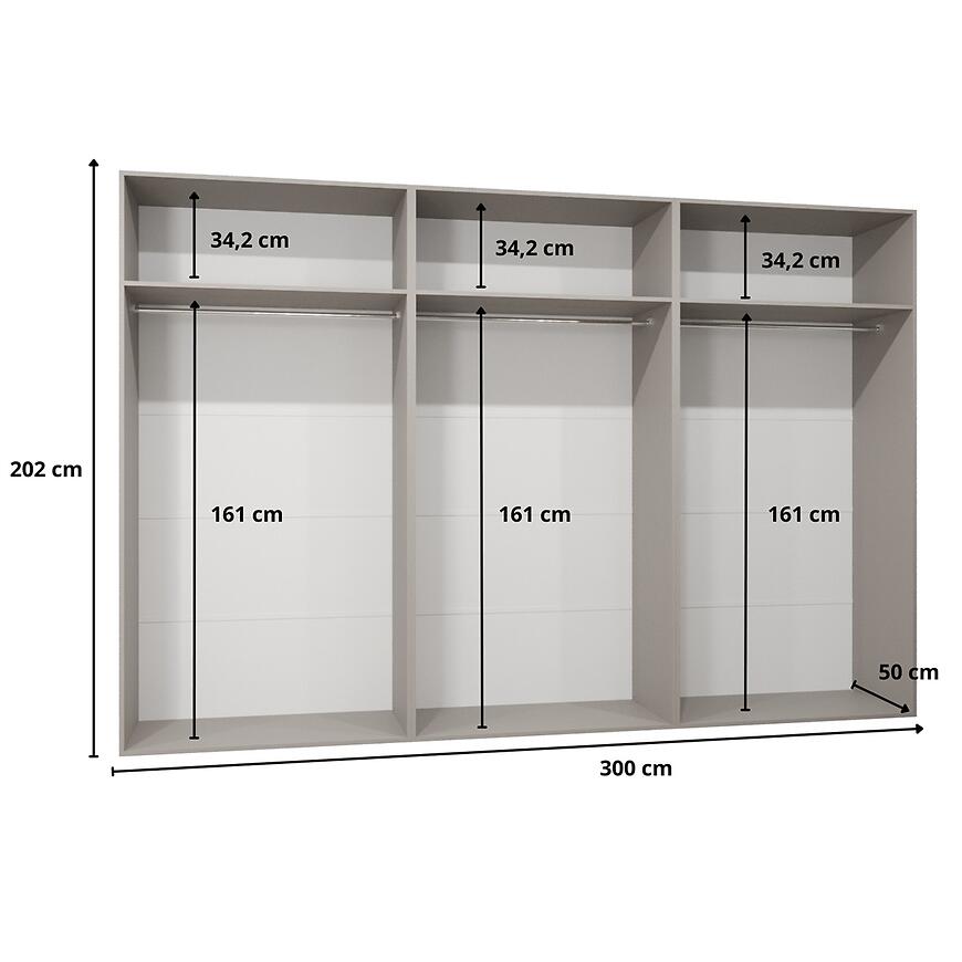 Wnętrze szafy Andrew 3-300 zaprojektowano z myślą o praktycznym przechowywaniu odzieży. Mebel posiada trzy funkcjonalne półki, które umożliwiają wygodne układanie ubrań złożonych czy dodatków tekstylnych. Dodatkowo zastosowano drążki na ubrania, pozwalające na swobodne zawieszenie koszul, sukienek, marynarek i płaszczy.