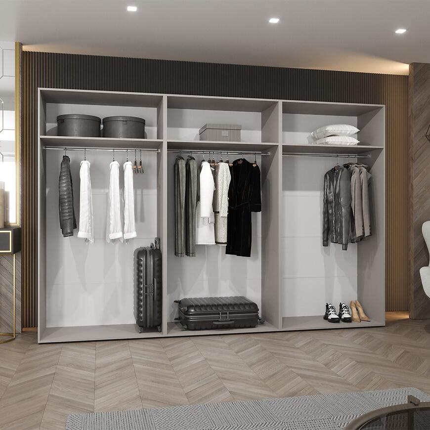 Taki układ organizacyjny sprawia, że szafa uchylna 300 cm świetnie sprawdzi się w codziennym użytkowaniu, pomagając utrzymać porządek w garderobie bez konieczności stosowania dodatkowych mebli przechowujących.