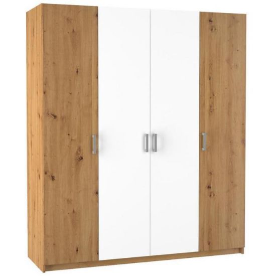 Szafa w kolorze dąb wotan/biały z kolekcji Angela to doskonała propozycja do pokoju dziennego, ale znajdzie swoje miejsce również w innym pomieszczeniu, jak na przykład - przedpokój czy garderobie, sypialni. Materiał wykonania to płyta laminowana. Szafa posiada półki, drążek na ubrania. Mebel będzie świetnym miejscem do wieszania ubrań, na buty lub inne domowe tekstylia. Nowoczesny styl mebli wpadnie do gustu każdemu, kto poszukuje eleganckiego, klasycznego, a zarazem nowoczesnego umeblowania. Idealnie wpasuje się w większość aranżacji. Szafa przeznaczona do samodzielnego montażu.
