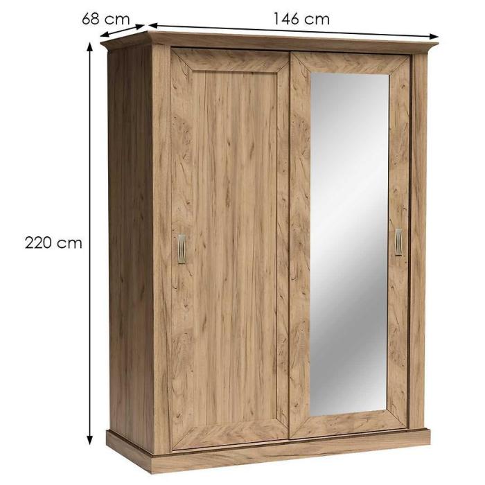 Szafa w kolorze kraft złoty z serii Antica to doskonała propozycja do pokoju dziennego, ale znajdzie swoje miejsce również w innym pomieszczeniu, jak na przykład - przedpokój czy garderobie, sypialni. Materiał wykonania to płyta laminowana/płyta meblowa. Szafa posiada półki, drążek na ubrania oraz szuflady , a także lustro, które sprawi, że pomieszczenie stanie się optycznie większe. Mebel będzie świetnym miejscem do wieszania ubrań, na buty lub inne domowe tekstylia. Styl mebli wpadnie do gustu każdemu, kto poszukuje eleganckiego, klasycznego, a zarazem nowoczesnego umeblowania. Idealnie wpasuje się w większość aranżacji. Szafa przeznaczona do samodzielnego montażu.