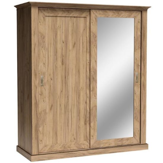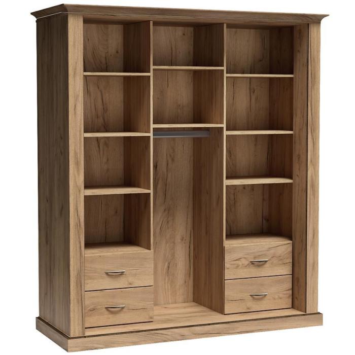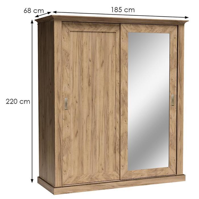 Szafa w kolorze kraft złoty z serii Antica to doskonała propozycja do pokoju dziennego, ale znajdzie swoje miejsce również w innym pomieszczeniu, jak na przykład - przedpokój czy garderobie, sypialni. Materiał wykonania to płyta laminowana. Szafa posiada półki, drążek na ubrania oraz szuflady , a także lustro, które sprawi, że pomieszczenie stanie się optycznie większe. Mebel będzie świetnym miejscem do wieszania ubrań, na buty lub inne domowe tekstylia. Styl mebli wpadnie do gustu każdemu, kto poszukuje eleganckiego, klasycznego, a zarazem nowoczesnego umeblowania. Idealnie wpasuje się w większość aranżacji. Szafa przeznaczona do samodzielnego montażu.
