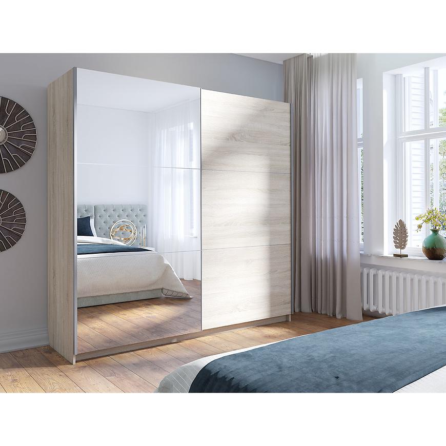 Szafa przesuwna, dwudrzwiowa z kolekcji Arsala to doskonała propozycja do sypialni, ale świetnie sprawdzzi się również w innym pomieszczeniu, jak na przykład - przedpokój, garderoba czy pokój młodzieżowy. Materiał wykonania to płyta wiórowa laminowana. Szafa uchylna Arsala posiada drążek, który ułatwi przechowywanie kurtek czy płaszczy. Wygląd szafy sprawi, że wpasuje się w większość aranżacji. Pojemny model szafy pozwoli na przechowanie butów, ubrań czy domowych tekstyliów. Szafa posiada drzwi przesuwne, dzięki czemu daje możliwość zagospodarowania pokoju z małym metrażem, gdzie dodatkowe centymetry są na wagę złota, a drzwi uchylne nie wchodzą w grę.