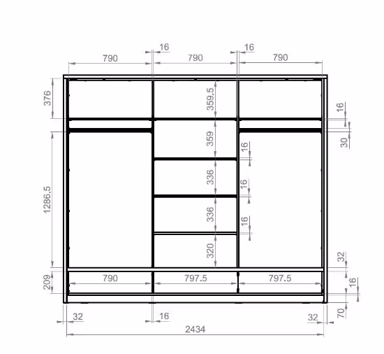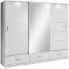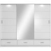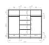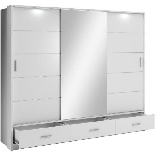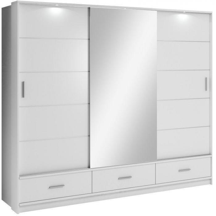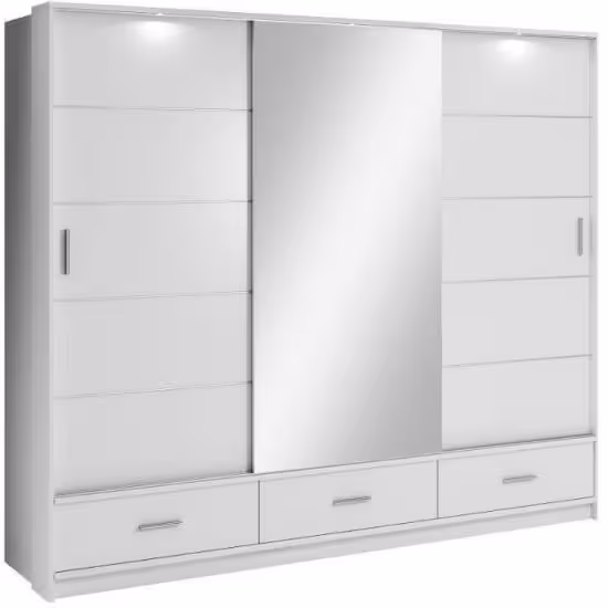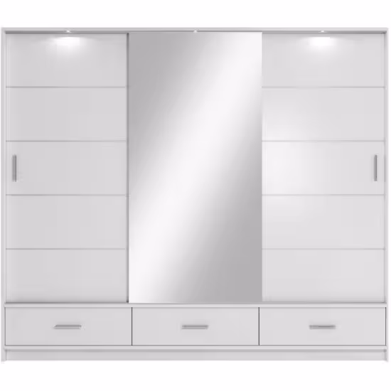 Szafa Arti 250 to idealna propozycja do nowoczesnej sypialni. Całość utrzymana w białej kolorystyce, w komplecie listwa z oświetleniem. W środku szafy zajdują się dwa drązki na wieszaki oraz 6 półek. Dodatkowo szafa wyposażona jest w trzy pojemne szuflady. Środkowe szklane drzwi pełnia rolę lustra,tak potrzebnego w każdej sypialni.