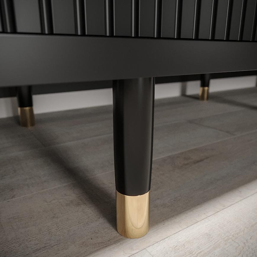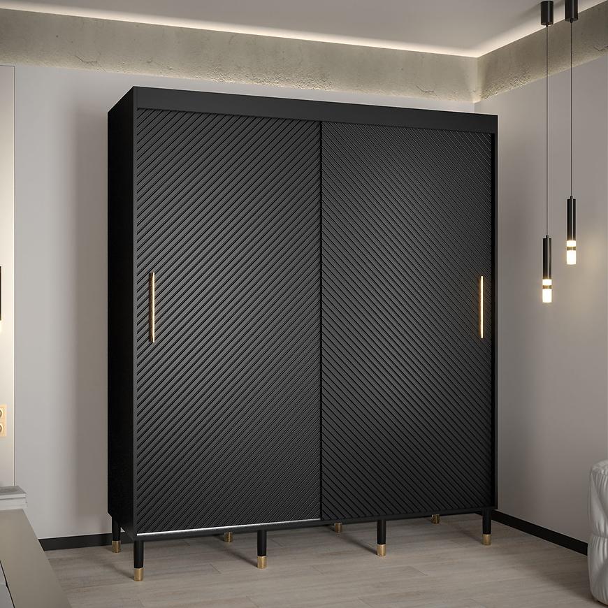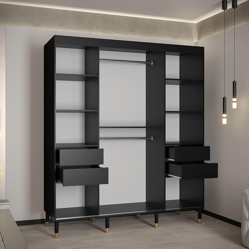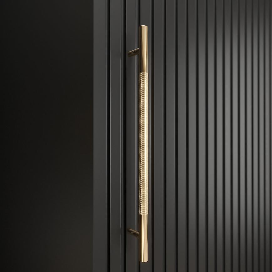 Szafa Aurora Jodełka to mistrzowski przykład nowoczesnego designu. Jej czarny front o wykończeniu matowym nadaje jej elegancji, podkreślając minimalistyczny charakter. Fronty wykonane są z płyty MDF, a cała konstrukcja korpusu oparta jest na laminowanej płycie wiórowej. Szafa wyposażona jest w drzwi przesuwne, co sprawia, że jest doskonałym wyborem dla tych, którzy cenią oszczędność przestrzeni. Dzięki temu rozwiązaniu nie musisz martwić się o to, czy są odpowiednio otwarte, aby zyskać dostęp do zawartości szafy.