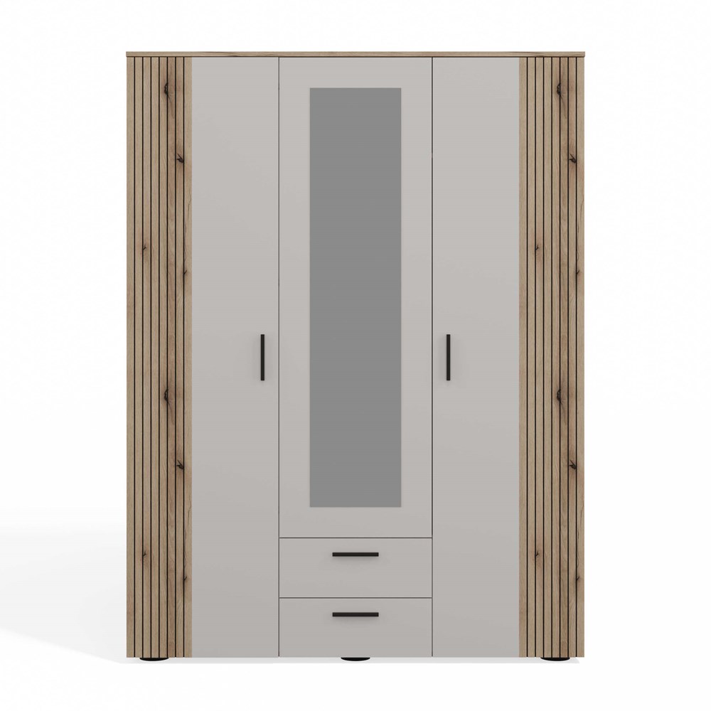 Szafa Avalon z lustrem to eleganckie i funkcjonalne rozwiązanie do nowoczesnych wnętrz, które doskonale łączy styl, jakość i wygodę użytkowania. Jej minimalistyczna kolorystyka w ciepłym odcieniu kaszmiru harmonijnie współgra z naturalnym dekorem Dąb Evoke, urozmaiconym modnymi, ryflowanymi elementami na bokach frontów. Nowoczesna forma z trzema drzwiami, w tym centralnym lustrem, idealnie wpisuje się w aranżacje w stylu nowoczesnym, skandynawskim i boho, a subtelne, czarne uchwyty z drewna dodają całości charakteru.
