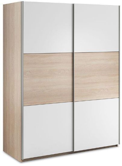 Szafa Avola 150 z przesuwanymi drzwiami to pakowny mebel, który przyda się w każdym domu. Można ją ustawić zarówno w garderobie, przedpokoju, jak i salonie. Jej kolor w tonacji jasnego drewna dębu sonoma łatwo komponuje się z innymi barwami. Uniwersalna szafa Avola 150 posiada front, który urozmaicony został poprzez zastosowanie matowych paneli w kolorze białym oraz w kolorze dąb sonoma. Wnętrze zostało podzielone na dwie części, w każdej z nich znajduje się drążek na wieszaki i półka ponad nim.