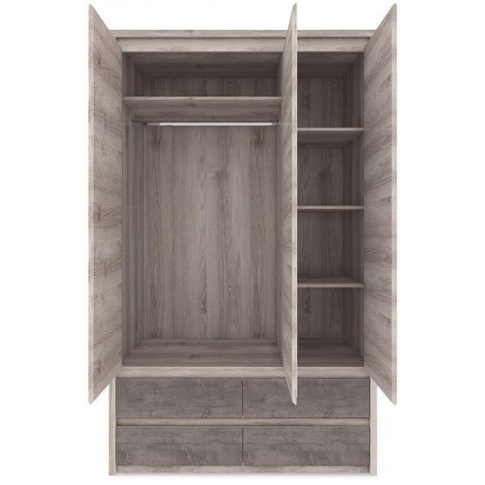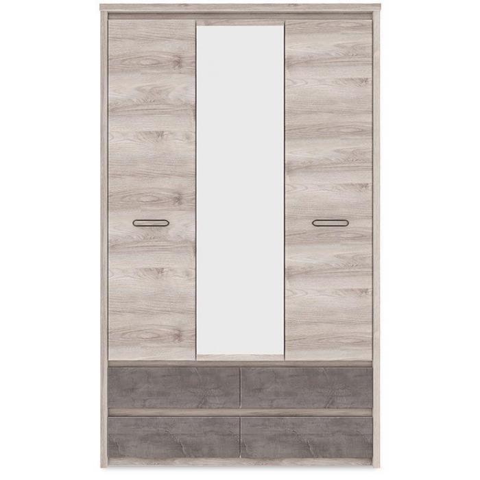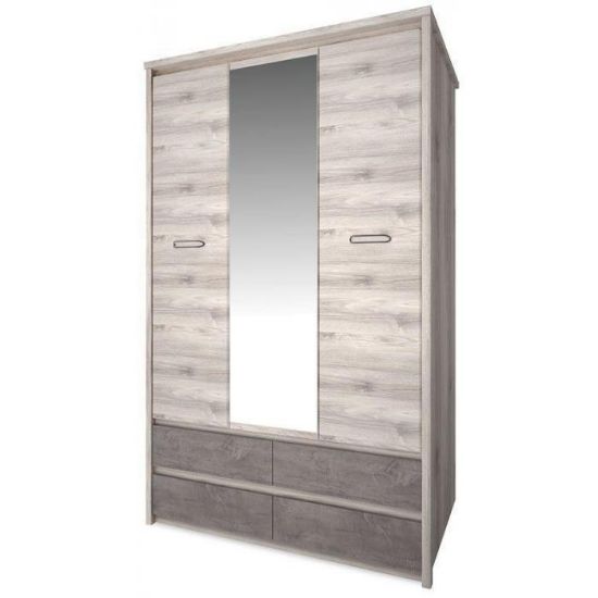 Szafa Axer 3D4S jest idealną propozycją dla miłośników minimalizmu, prostoty, ale przede wszystkim funkcjonalności. Mebel jest esencją skandynawskiego designu, dlatego znakomicie wpasuje się w aranżację nowoczesnych pomieszczeń. Zastanawiając się nad dekoracją wnętrz, coraz częściej wybiera się przedmioty bezpośrednio nawiązujące do natury. Modna obecnie szara barwa, w tym wydaniu w odcieniu Kasztan Nairobi, znakomicie łączy się z frontowymi wstawkami szafy w odcieniu Onyx. Mebel posiada 4 szuflady na prowadnicach kulkowych, co stanowi gwarancję wygody użytkowania. Ponadto w trzydrzwiową szafę, z delikatnymi i nierzucającymi się w oczy metalowymi uchwytami, wkomponowano funkcjonalne, a zarazem ozdobne lustro. Garderobę wykonano ze specjalnie laminowanej płyty, a w celu podkreślenia jej struktury delikatnie pogrubiono boki. Szafa Axer 3D4S we wnętrzu lewego, podwójnego skrzydła skrywa półkę, zamontowaną nad drążkiem na wieszaki, a w prawym mniejszym skrzydle trzy półki równej wielkości. Najlepiej sprawdzi się w sypialni, jak i w pokoju garderobianym, ponieważ daje poczucie porządku i pomaga zachować przestronność. Dlatego zaprojektowano ją w wymiarach odpowiadających potrzebom użytkownika.