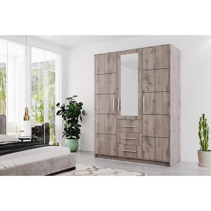 Szafa w kolorze dąb wellington z kolekcji Bali to doskonała propozycja do pokoju dziennego, ale znajdzie swoje miejsce również w innym pomieszczeniu, jak na przykład - przedpokój czy garderobie, sypialni. Materiał wykonania to płyta laminowana. Szafa posiada półki, drążek na ubrania. oraz szuflady. Duża szafa posiada również lustro, które sprawi, że pomieszczenie stanie się optycznie większe. Mebel będzie świetnym miejscem do wieszania ubrań, na buty lub inne domowe tekstylia. Nowoczesny styl mebli wpadnie do gustu każdemu, kto poszukuje eleganckiego, klasycznego, a zarazem nowoczesnego umeblowania. Idealnie wpasuje się w większość aranżacji. Szafa przeznaczona do samodzielnego montażu.