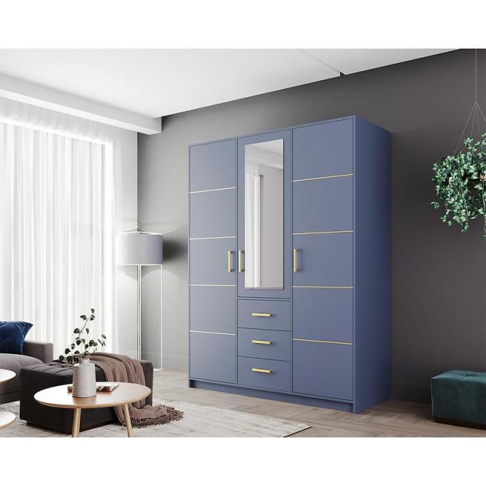 Szafa w kolorze zgaszony błękit z kolekcji Bali to doskonała propozycja do pokoju dziennego, ale znajdzie swoje miejsce również w innym pomieszczeniu, jak na przykład - przedpokój czy garderobie, sypialni. Materiał wykonania to płyta laminowana. Szafa posiada półki, drążek na ubrania. oraz szuflady. Duża szafa posiada również lustro, które sprawi, że pomieszczenie stanie się optycznie większe. Mebel będzie świetnym miejscem do wieszania ubrań, na buty lub inne domowe tekstylia. Nowoczesny styl mebli wpadnie do gustu każdemu, kto poszukuje eleganckiego, klasycznego, a zarazem nowoczesnego umeblowania. Idealnie wpasuje się w większość aranżacji. Szafa przeznaczona do samodzielnego montażu.