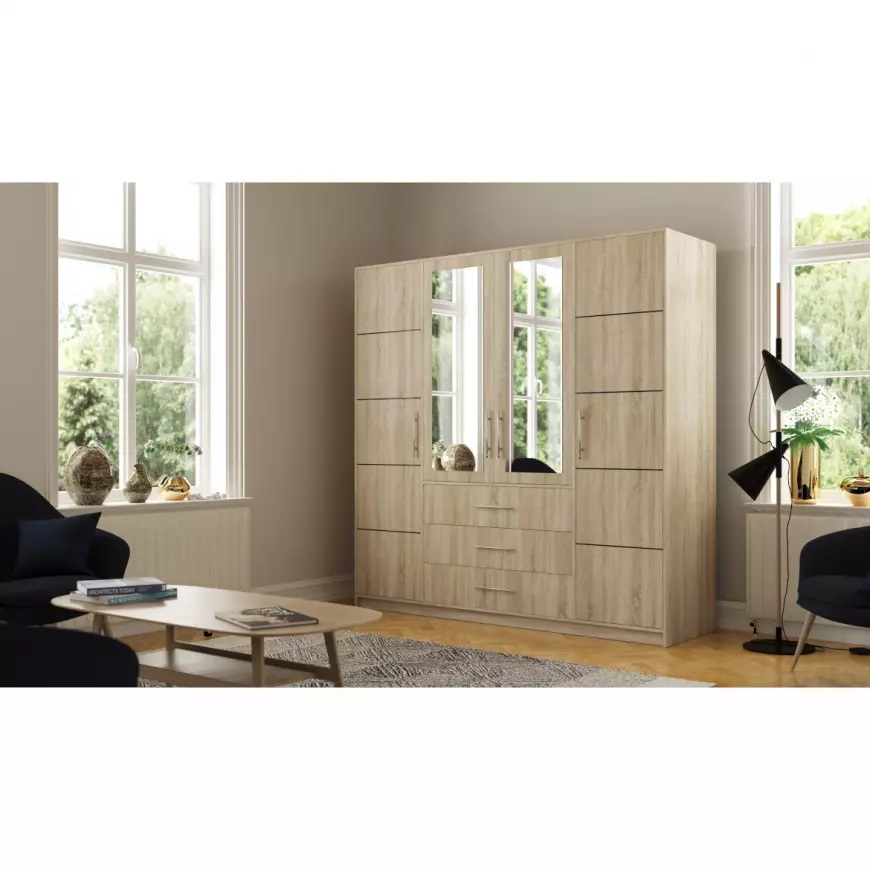 Szafa w kolorze dąb sonoma z kolekcji Bali to doskonała propozycja do pokoju dziennego, ale znajdzie swoje miejsce również w innym pomieszczeniu, jak na przykład - przedpokój czy garderobie, sypialni. Materiał wykonania to płyta laminowana. Szafa posiada półki, drążek na ubrania. oraz szuflady. Duża szafa posiada również lustro, które sprawi, że pomieszczenie stanie się optycznie większe. Mebel będzie świetnym miejscem do wieszania ubrań, na buty lub inne domowe tekstylia. Nowoczesny styl mebli wpadnie do gustu każdemu, kto poszukuje eleganckiego, klasycznego, a zarazem nowoczesnego umeblowania. Idealnie wpasuje się w większość aranżacji. Szafa przeznaczona do samodzielnego montażu.