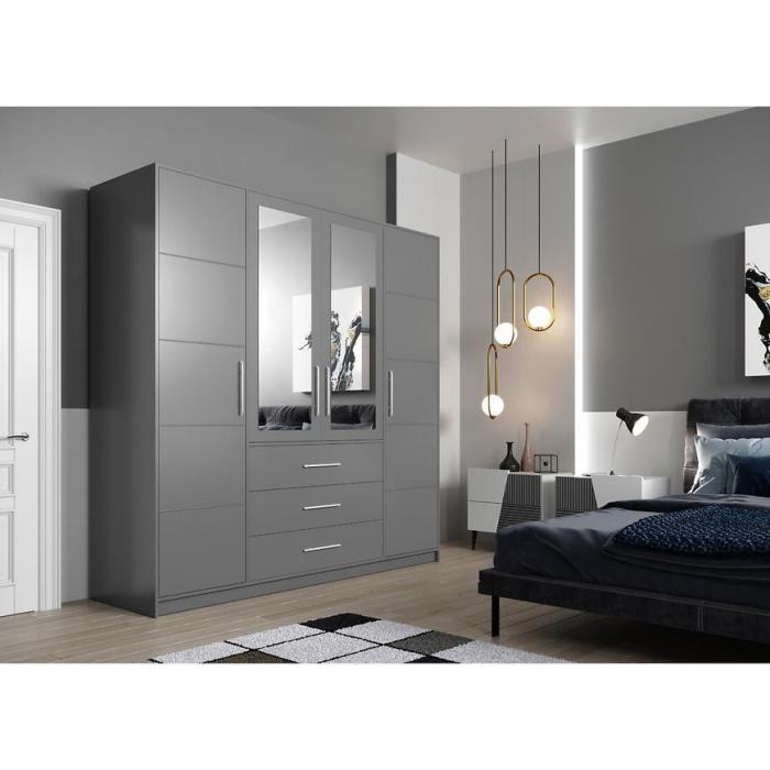Szafa w kolorze grafit z kolekcji Bali to doskonała propozycja do pokoju dziennego, ale znajdzie swoje miejsce również w innym pomieszczeniu, jak na przykład - przedpokój czy garderobie, sypialni. Materiał wykonania to płyta laminowana. Szafa posiada półki, drążek na ubrania. oraz szuflady. Duża szafa posiada również lustro, które sprawi, że pomieszczenie stanie się optycznie większe. Mebel będzie świetnym miejscem do wieszania ubrań, na buty lub inne domowe tekstylia. Nowoczesny styl mebli wpadnie do gustu każdemu, kto poszukuje eleganckiego, klasycznego, a zarazem nowoczesnego umeblowania. Idealnie wpasuje się w większość aranżacji. Szafa przeznaczona do samodzielnego montażu.
