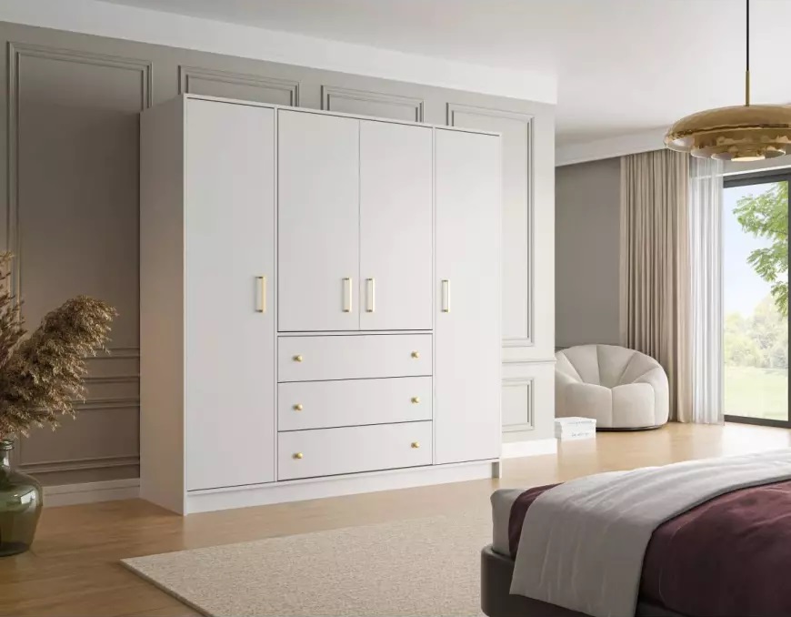 Szafa czterodrzwiowa Bali D4 to elegancki i funkcjonalny mebel, który doskonale wpasuje się w różne wnętrza, takie jak sypialnia czy przedpokój. Wykonana z wysokiej jakości płyty wiórowej laminowanej, charakteryzuje się wyjątkową trwałością i estetyką. Dostępna w klasycznym, białym kolorze z matowym wykończeniem, szafa Bali D4 wniesie do Twojego wnętrza powiew świeżości i nowoczesności.
